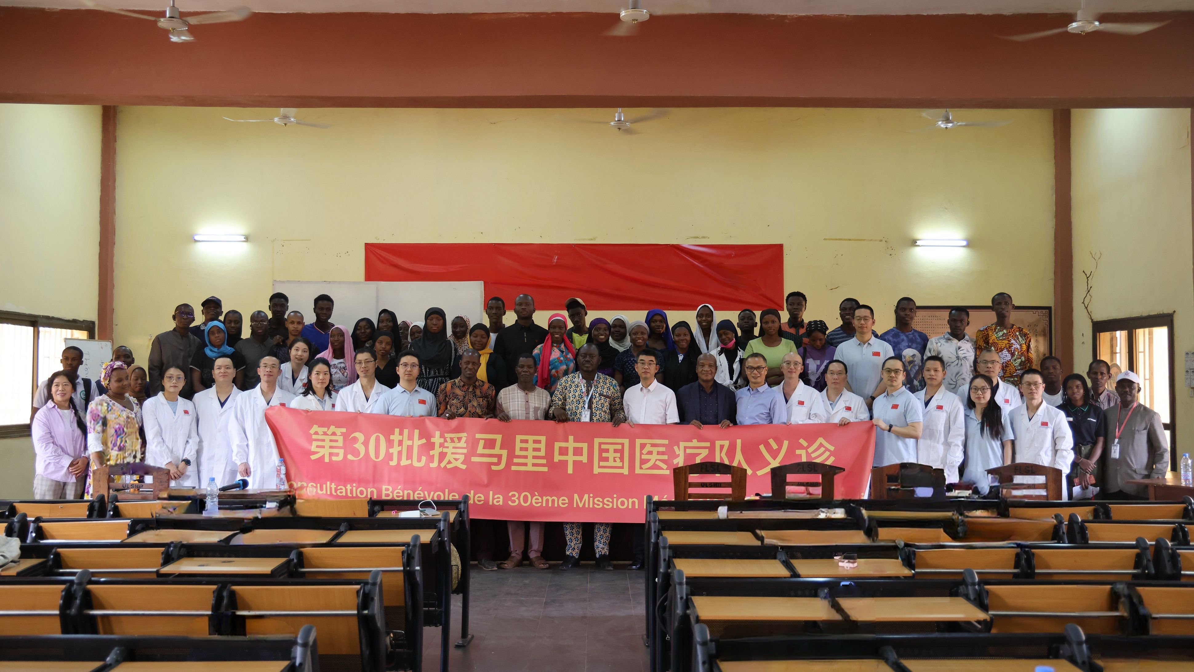 12月11日,学校马里巴马科扬博·沃洛根大学孔子学院与第30批援马里中国医疗队共同举办义诊活动。巴马科扬博·沃洛根大学校长兼孔子学院马方院长贝尔科、前任校长特拉奥雷、副校长柯内、宣传部部长嘉凯德与孔子学院师生百余人参加本次活动。活动由孔子学院中方院长刘祖勤主持。