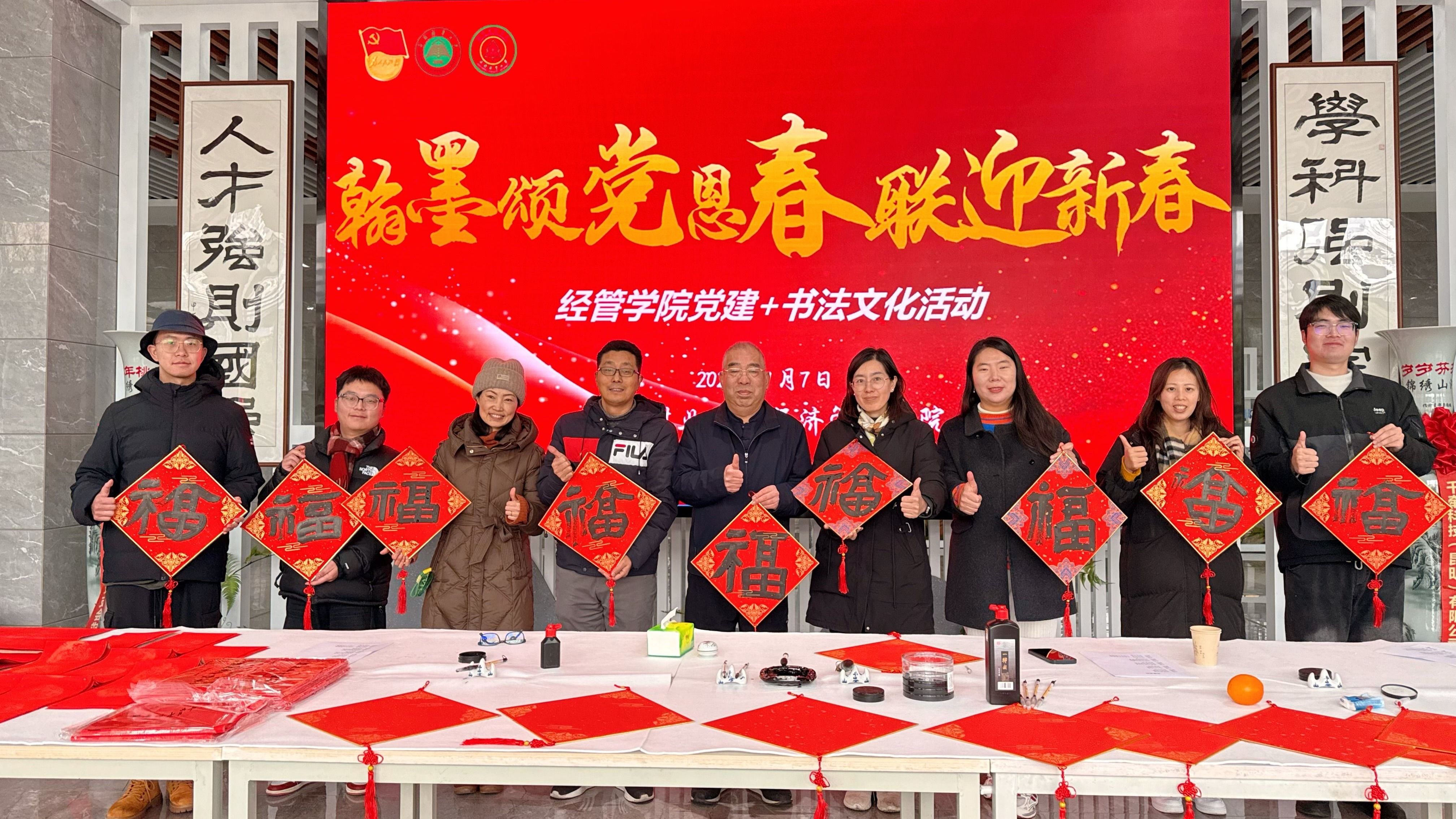 1月7日,经济管理学院在学院大厅举办“翰墨颂党恩 春联迎新春”党建+书法文化主题活动,学院特聘教授陈建成,为师生送上新春“福”字与对联。
