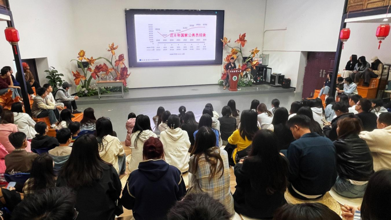 本次讲座邀请在公考政策分析、选岗指导、考试能力指导方面有多年讲课经验的田金龙老师担任主讲嘉宾。田老师针对公务员考试招录公告、近8年招考政策及变化趋势进行深入分析,对公考备考方法和技巧给予指导,为同学们的职业规划提出意见建议。同时,还解答了同学们在选择报考岗位时常见的困惑和问题。