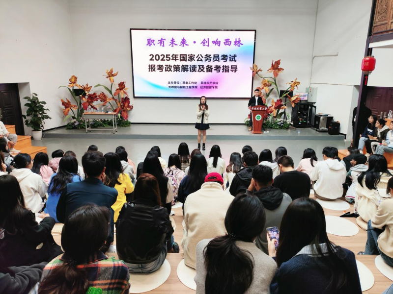 为给同学们提供更加全面的职业规划指导,助力学校毕业生高质量就业,10月17日,由就业工作处、经济管理学院、园林园艺学院和大数据与智能工程学院联合举办的“职有未来·创响kaiyun体育”公务员考试报考政策解读与备考指导讲座在创想园举行。讲座吸引了各专业近200名学生参加。