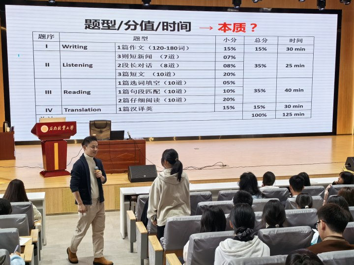为提高英语四级考试通过率,助力学生提升英语水平,10月13日,教务处(课程中心)邀请校外专家胡健康老师到校开展全国大学英语四级考试培训。在校学生共计700余人踊跃参与。