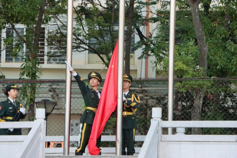 仪式开始,英姿飒爽的校国旗护卫队迈着整齐的步伐护送国旗而来,伴随着激昂的国歌声,五星红旗冉冉升起,在场的全体师生向国旗行注目礼,深怀对祖国无限的热爱和崇高的敬意。