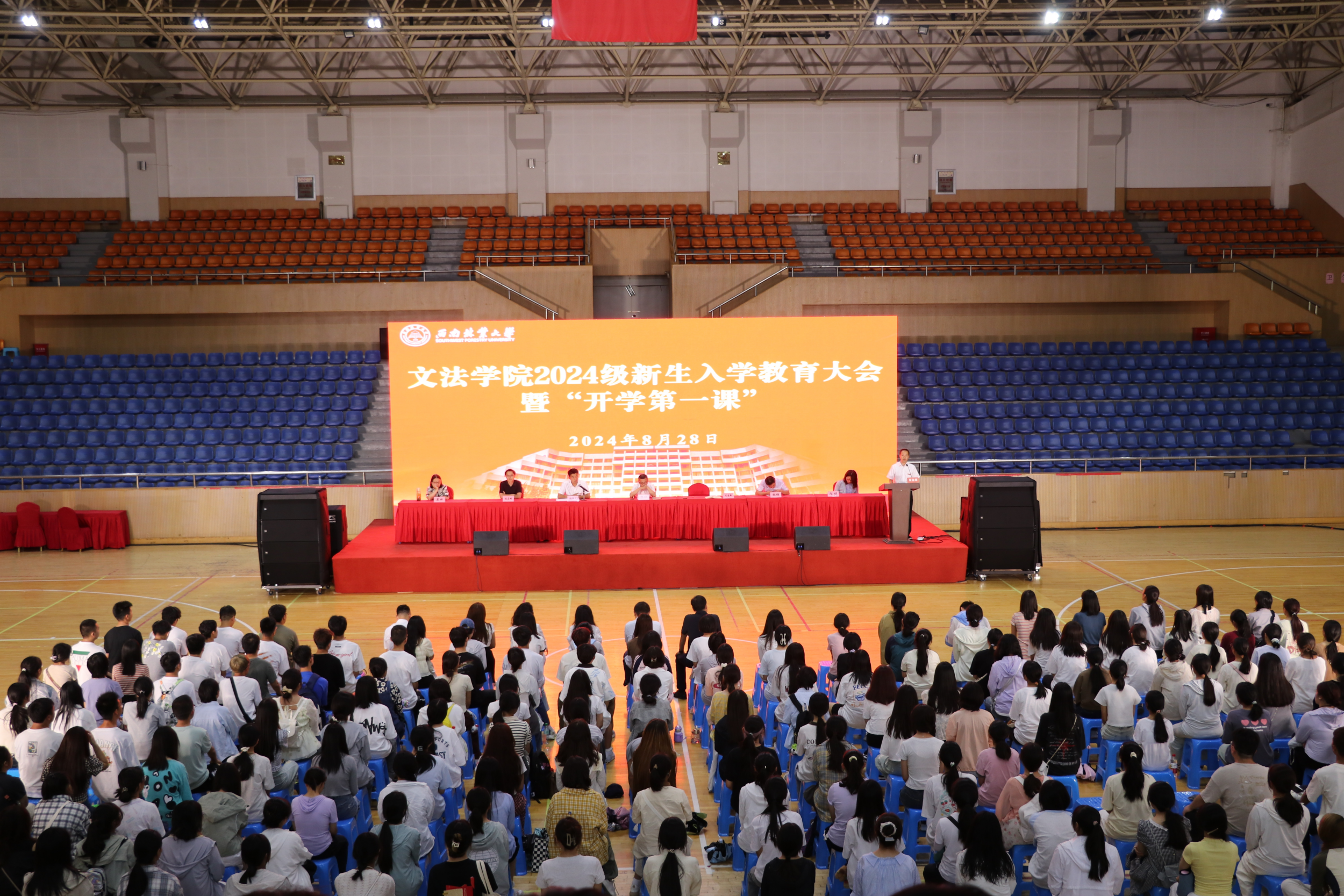 为教育引导2024级新生扣好大学阶段第一粒扣子,帮助同学们尽快适应大学生活,明确学习目标,做好学业规划,8月28日,文法学院召开2024级新生入学教育大会暨“开学第一课”。学院党委书记杨欣、院长李国新、副院长张强、各系主任、科室负责人、新生班主任及2024级全体新生参加会议。大会由学院党委副书记张译文主持。