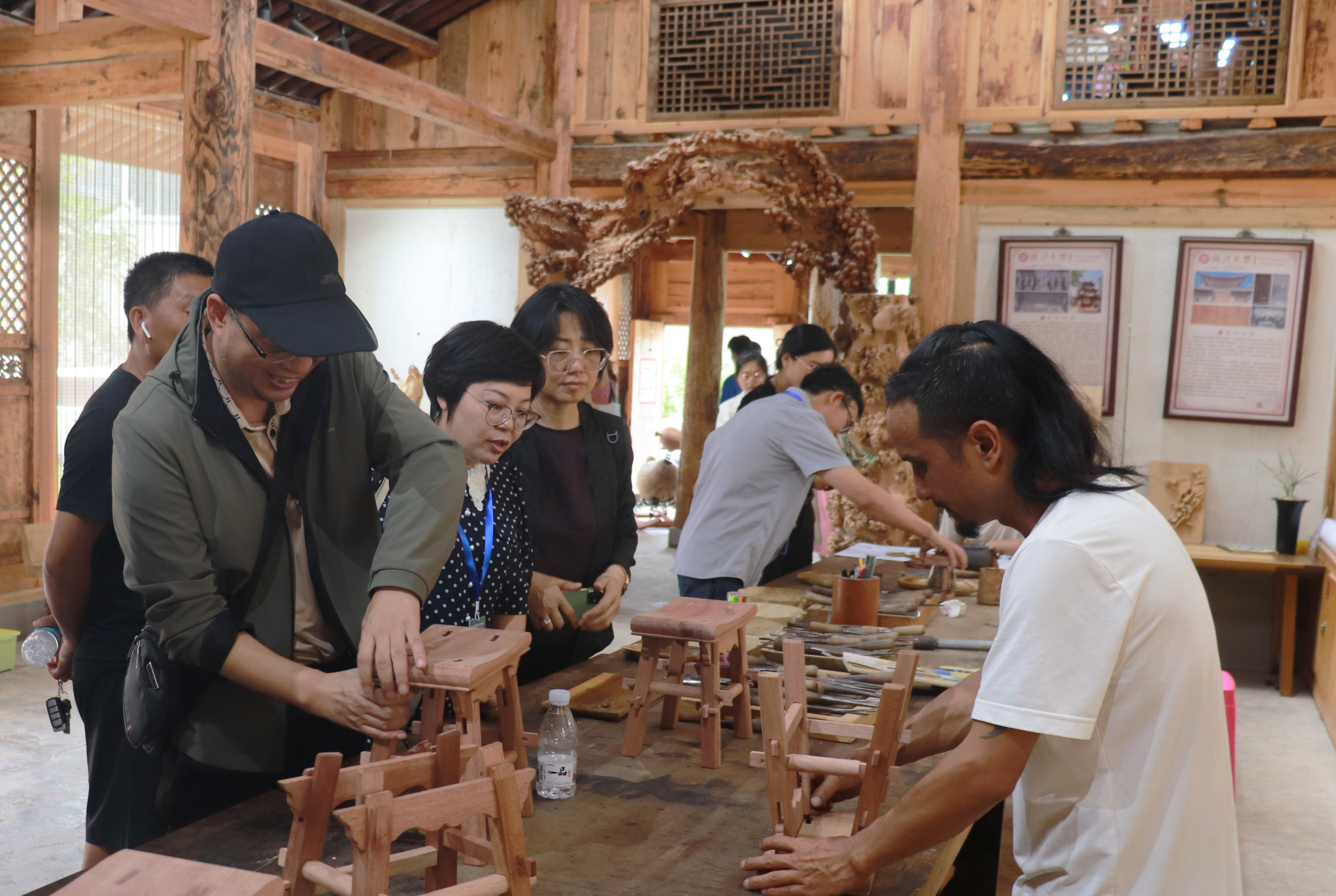 实践团实地调研了剑川县木雕场,了解剑川木雕的历史、工艺流程、文化价值及其在现代设计中的应用,与正高级工艺美术师、国家级非物质文化遗产代表性项目(剑川木雕)国家级代表性传承人段四兴进行面对面的交流,了解创作理念、技艺传承及面临的挑战等。双方表示将建立长期合作关系,通过多种形式为这项非遗项目的传承和创新注入新的力量。