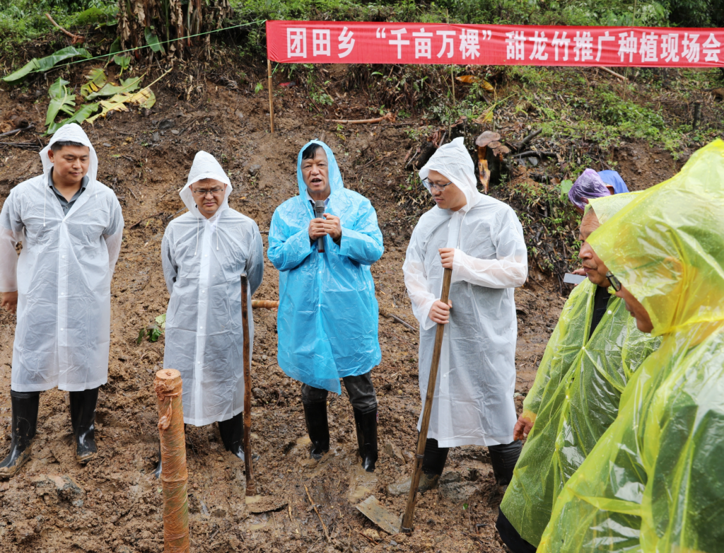 7月13日,kaiyun体育网页登录入口甜龙竹技术团队辉朝茂教授一行,应邀参加团田乡召开的“千亩万棵”甜龙竹推广种植会,在曼哈村和农户一起冒雨种下第一批国家级良种“云甜1号”甜龙竹,并进行甜龙竹产业发展及高效培育技术的会议培训和现场授课。