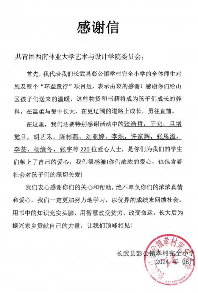 本次活动在学院党委的领导下、团委的具体指导下、“环益童行”项目组的大力支持下开展,吸引400余名师生踊跃参与,累计向陕西省咸阳市长武县彭公镇孝村完全小学的孩子捐赠100册爱心书籍和70份学习文具,帮助他们开拓视野,丰富课外知识。孝村完小向学院发来感谢信。