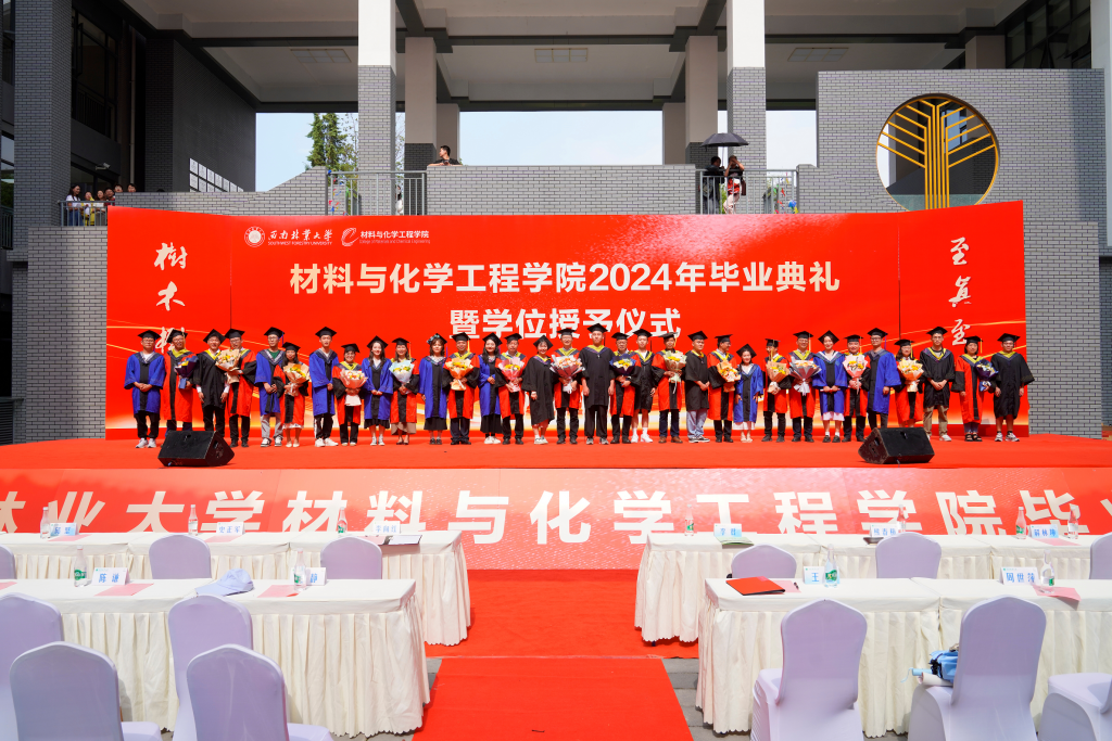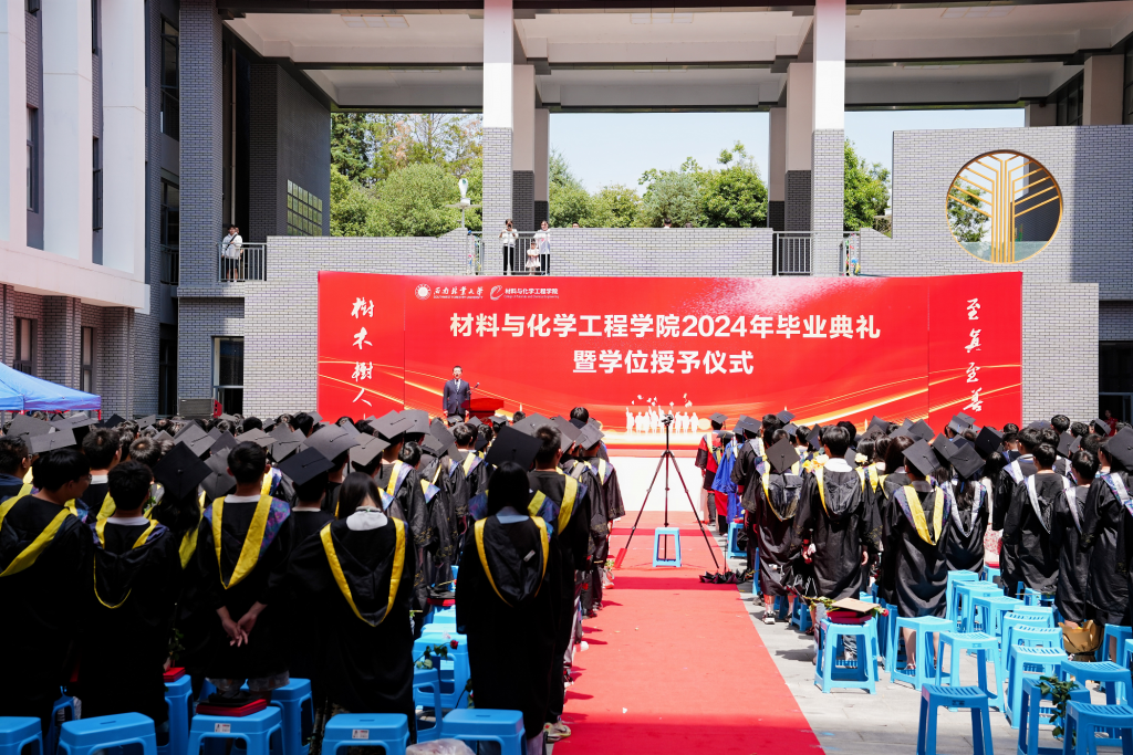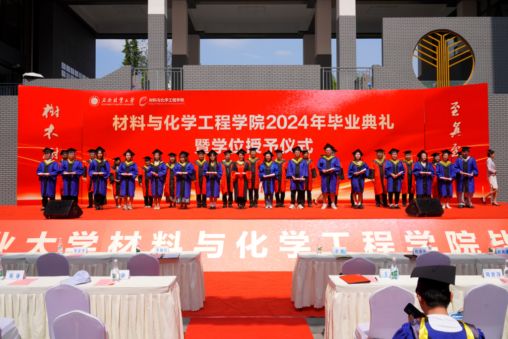 材料与化学工程学院院长李向红老师宣读优秀毕业生表彰决定。学院教师代表王瑛教授向毕业生寄语。毕业生代表俞力文、史锋分别上台表达对母校和学院的感激之情。随后,举行了学位授予仪式,毕业生们依次上台拨穗正冠。毕业生代表为教师献上鲜花,表达对老师们辛勤付出的感激之情。