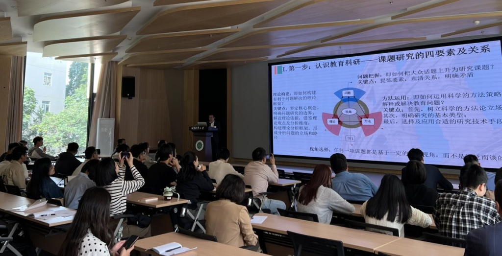刘六生以《学术思维与高校教师科研能力提升》为主题,从认识教育科研、把握教育问题、设计研究方案、开展教育研究、产出学术成果、评价研究水平6个方面系统介绍创新研究思路与研究方法,并针对课题申报书样例,解析专家关注的要点进行讲解。讲座过程中还与师生进行互动答疑解惑。