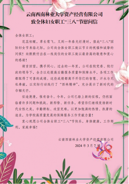 “三八”节前夕,公司致全体女职工慰问信 ,号召她们继续发扬新时代女性之美,辛勤耕耘、攻坚克难,以更加饱满的热情、执着的追求,为学校高质量发展的保障服务工作贡献力量。