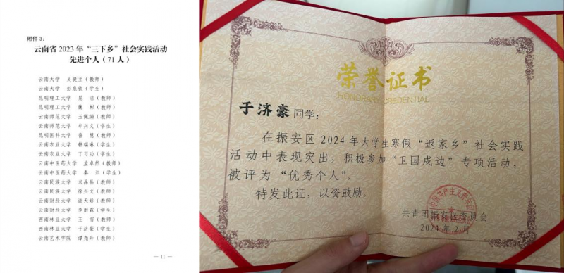 学院于济豪同学在“卫国戍边”专项活动中,讲述了抗美援朝期间家乡人民全力以赴支援战斗前线的真实历史故事,获得云南省2023年“三下乡”社会实践活动“先进个人”称号,并被共青团振安区委员会评为“优秀个人”。
