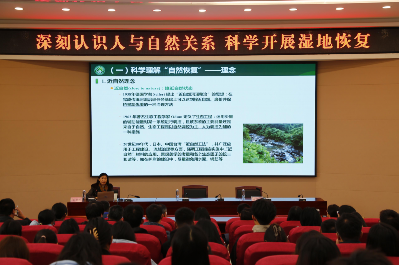 崔丽娟研究员从人与自然和谐共生的关系出发,系统讲解了湿地近自然恢复的科学基础和技术流程,并针对每一部分进行了详细讲解。此外,崔老师分享了两个湿地恢复的典型案例,并系统总结了湿地恢复过程中常见的误区。讲座结束后,崔院长与同学们进行互动交流。同学们表示这次讲座精彩纷呈,收获颇丰。