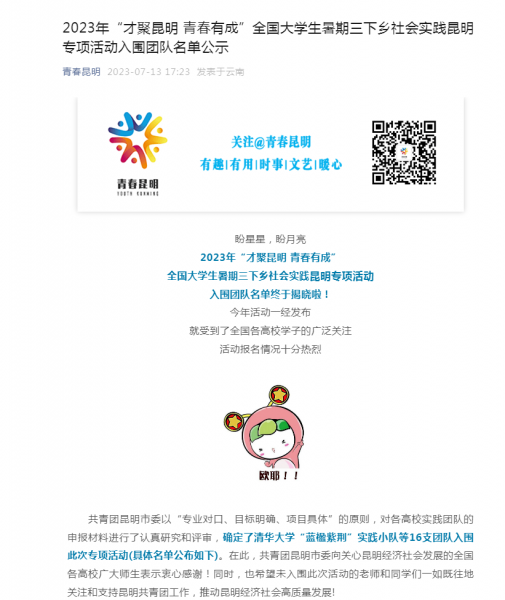 7月13日,2023年“才聚昆明 青春有成”全国大学生暑期三下乡社会实践昆明专项活动入围团队名单揭晓。艺术与设计学院环境设计专业2020级学生廖建雪团队的“红梨技术推广”项目在王冬老师的指导下成功入围。