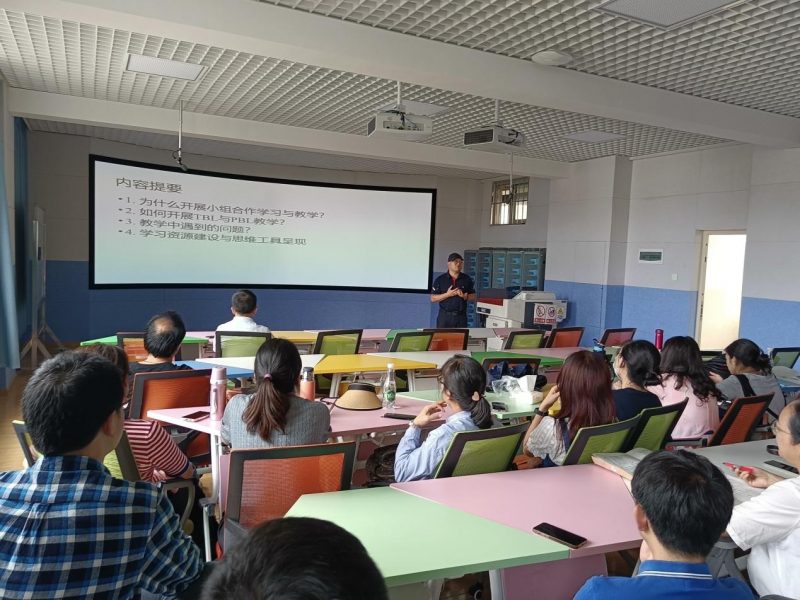 教研会以小组合作与教学,大学英语四、六级作文评分标准为主题,邀请3位教师进行教学经验交流。A班二级起点班王峰老师在学情分析的基础上,结合新时代新经济形态下教育4.0的要求和Bloom认知目标分类对学习深度的要求,详细地介绍合作学习与教学实践。万成宾和汪学华两位老师用大量的实例,分享在批阅大学英语四、六级试卷时得出阅卷经验,以及评分标准和评分流程。
