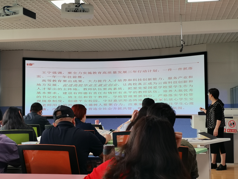 学院党委书记姜丽红通报学院目前毕业去向落实率,并对就业形势进行分析。她表示,促进高校毕业生就业创业,是实施云南省教育高质量发展三年行动计划重要环节,学院全体教师务必提高认识,全员参与促进学生就业。