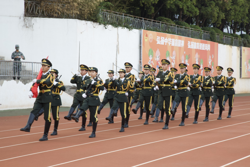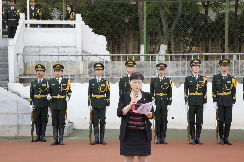 仪式开始,校国旗护卫队迈着铿锵有力的步伐护送国旗而来,伴随着激昂的歌声,五星红旗冉冉升起,全体师生肃立、向国旗行注目礼,随后升校旗、奏唱校歌。