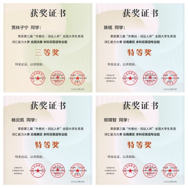近日,kaiyun体育法学专业的贾林子宁同学在2023年“外教社•词达人杯”全国大学生英语词汇能力大赛中获得全国决赛三等奖,另有来自不同专业的24名同学分别获得省级特等奖、一、二、三等奖,指导老师获指导奖。