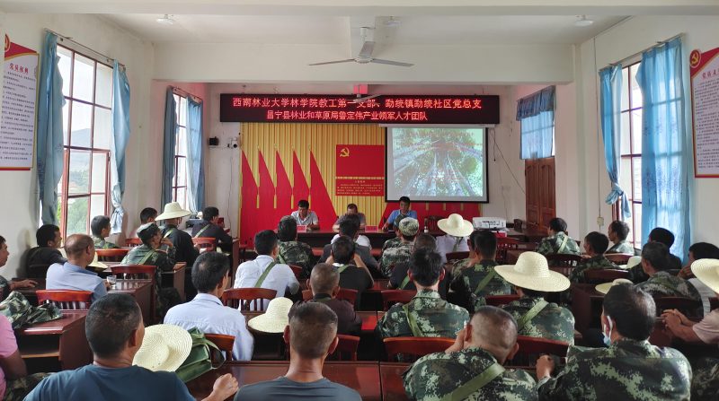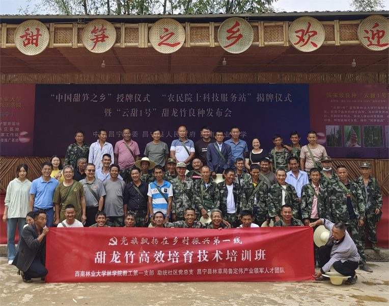 林学院党委正处级组织员王宏虬副教授、教工第一党支部支部书记辉朝茂教授、孙茂盛副教授、县林草局正高级工程师鲁定伟组织开展了“甜龙竹高效培育技术培训班”理论教学,并在芒东山甜龙竹示范基地进行实地技能培训。