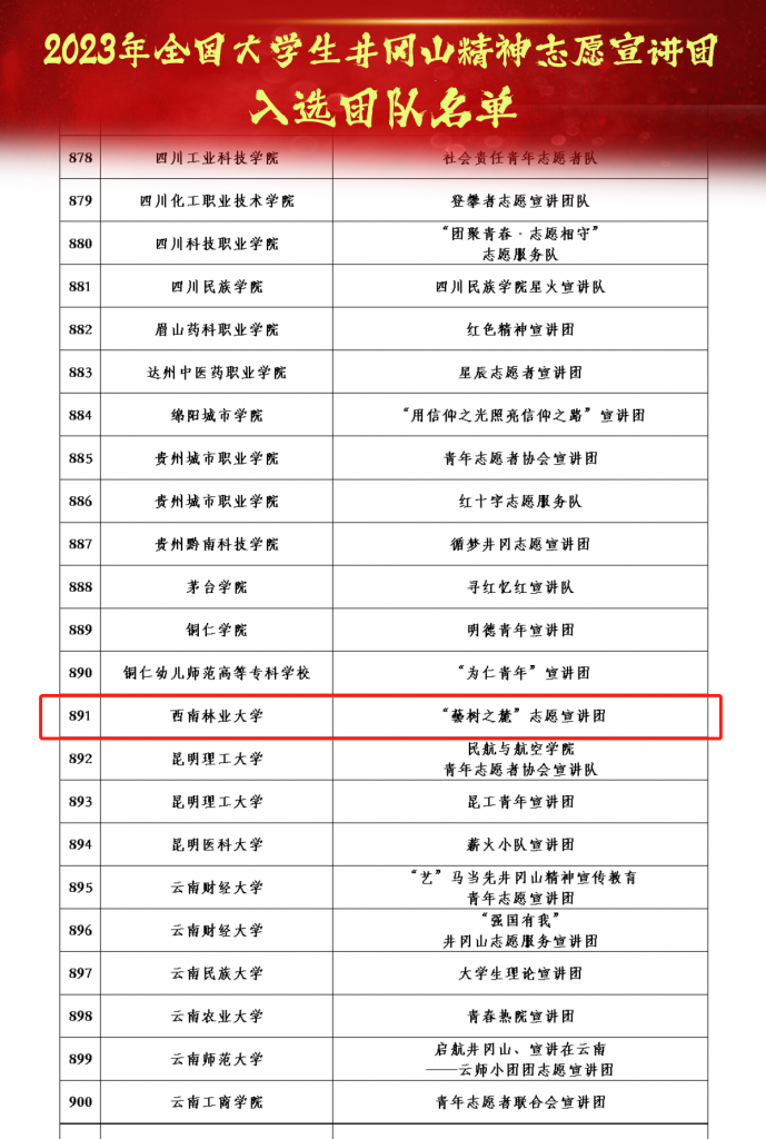 近日,团中央青年志愿者行动指导中心、全国青少年井冈山革命传统教育基地、井冈山管理局联合发布《2023年全国大学生井冈山精神志愿宣讲团入选团队名单》。kaiyun体育艺术与设计学院“藝树之麓”志愿宣讲团从全国650所高校的1615支团队中脱颖而出,成功入选。