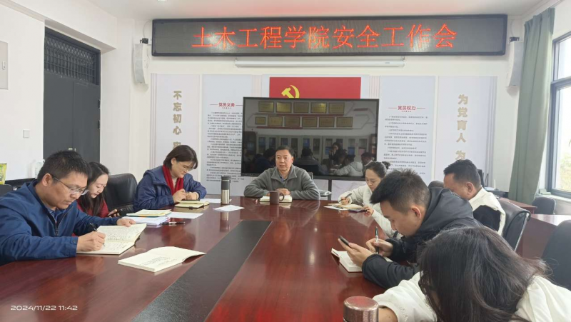 11月22日,土木工程学院召开安全工作会议。学院党委书记谭泽飞、院长孙微微、党委副书记何妮娇、副院长王秋华,学院全体辅导员、班主任、实验员参加会议。会议由谭泽飞主持。