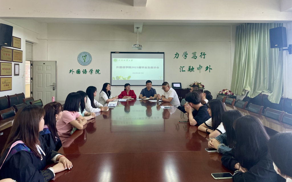 为真实、及时了解毕业生的心声、诉求,听取毕业生对学校、学院的意见和建议,外国语学院于5月18日召开2023届毕业生座谈会。学院党委书记姜丽红、院长何新元、副书记李法营,学工办主任、团委书记、各专业负责人及20余名学生代表参加会议。