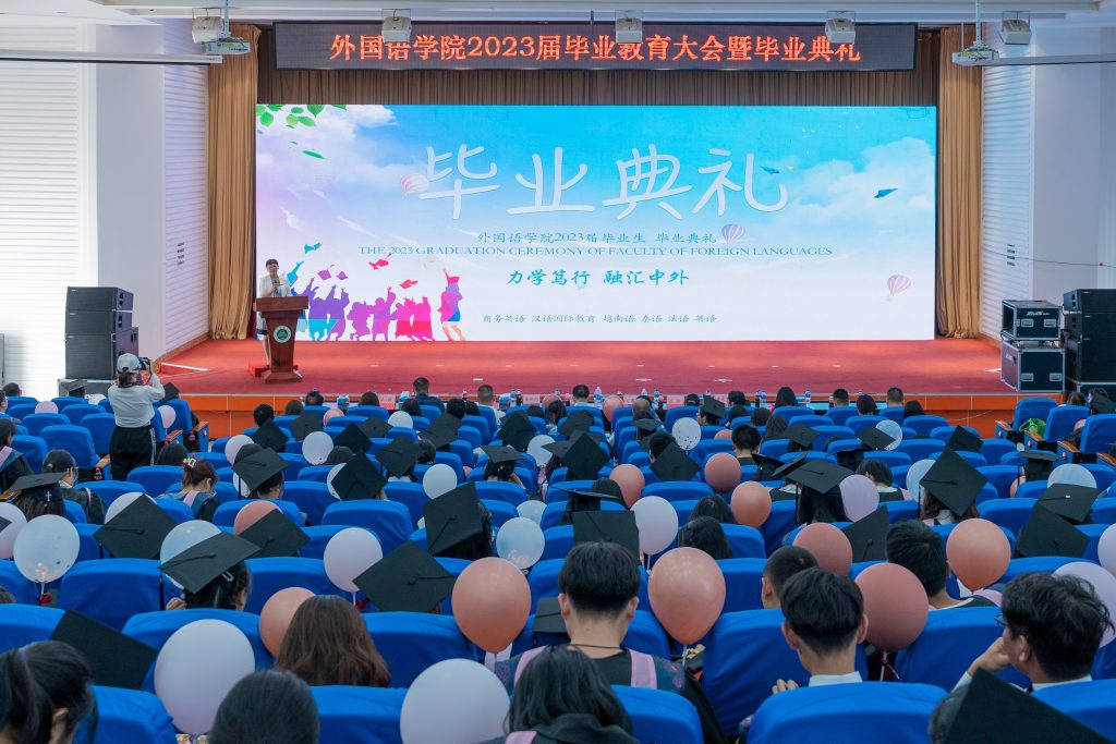 为做好2023届毕业生离校教育工作,推动2023届就业创业工作的开展,5月19日,外国语学院举行2023届毕业教育暨毕业典礼。学院党委书记姜丽红、院长何新元、党委副书记李法营,各系部主任及专业负责人、团学老师、辅导员、班主任及2023届全体毕业生参加典礼。