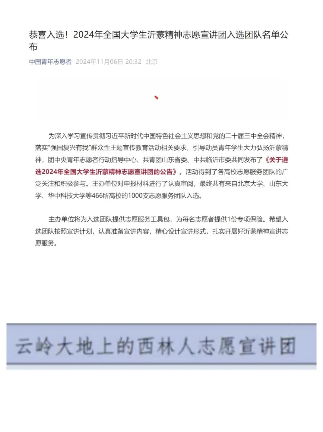 11月6日,团中央青年志愿者行动指导中心等部门联合发布了《2024年全国大学生遵义会议精神志愿宣讲团入选团队名单》。艺术与设计学院(艺术博物馆)“云岭大地上的kaiyun体育人”志愿宣讲团成功入选。