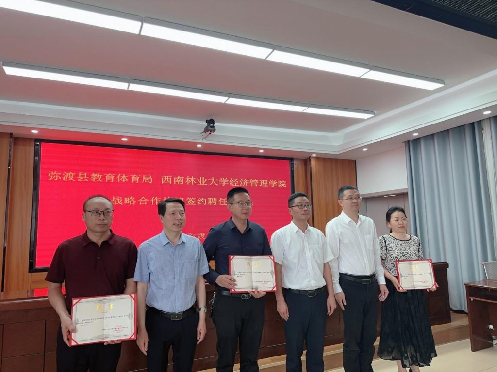 经济管理学院与弥渡县教育体育局签订合作协议。学院领导班子成员为李聪、单文武、邹平颁发公共管理硕士(MPA)教育中心行业导师聘书。