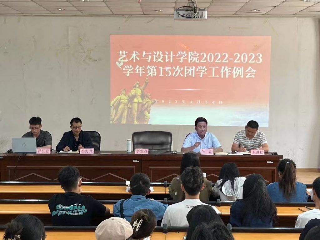 4月24日,艺术与设计学院召开2022—2023学年第15次团学组织例会,院长李生森,学院党委副书记李浩,学生工作办公室主任秦海龙、学生团委副书记罗征意、各团学组织成员、全院班长及团支书参加会议。会议由院团委教师王进松主持。