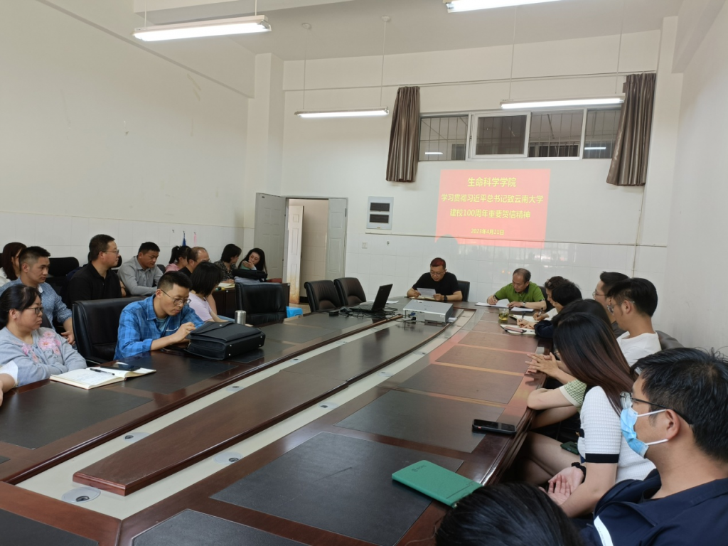 4月21日,生命科学学院召开教职工大会,传达学习习近平总书记致云南大学成立100周年贺信精神。会议上,学院党委书记王永生领学贺信全文,院长何承忠传达学校党委扩大会议关于专题学习习近平总书记致云南大学建校100周年贺信的会议精神。