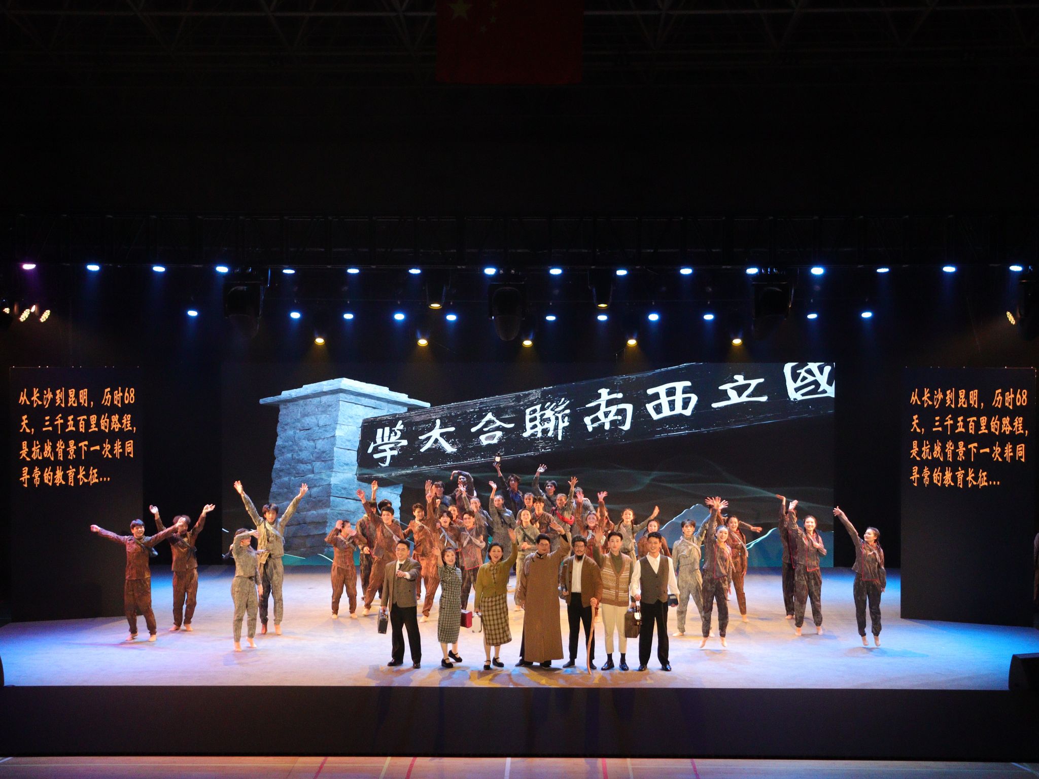 《西南联大》是根据真实历史事件改编而成的音乐舞蹈史诗。它所展现的是卢沟桥事变后,北大、清华、南开三所大学因战乱西迁昆明,最后组成西南联大的历史事件。全剧分为五个篇章。序章《弦歌不辍》,以西南联大校钟引入,悠扬而深沉,仿佛穿越时空的呼唤,拉开了《西南联大》剧目的帷幕;《百年沧桑 薪火南迁》,悲情再现三校师生历经流离、终聚昆明的坎坷历程;《峥嵘岁月 联大往事》,师生们在敌机轰鸣中矢志不渝,坚守学习生活的坚韧精神跃然眼前;《民主堡垒 南天火炬》,联大师生在战火中培育民主的火种,成为南天的火炬,照亮国家的未来;《苍穹之光 血脉流芳》以西南联大学子遍布天下、献身国家的辉煌成就圆满落幕;尾声《大师之大》,更将观众思绪牵回1946年西南联大毕业照定格的刹那,历史之重、文化之深,令人悠然神往。