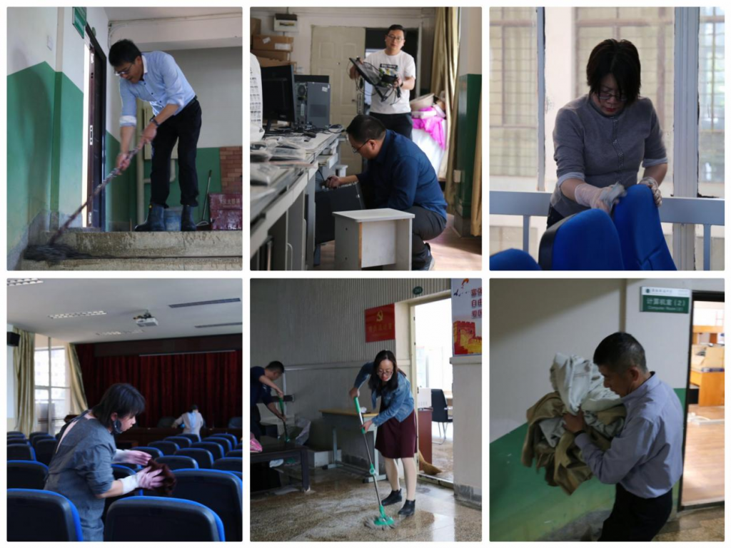 在继续教育楼外墙改造施工完成后,为建设学院更加干净、和谐、美丽的工作环境,以崭新的院容院貌迎接2023级新生入校,学院党总支书记肖辉、院长熊智带头做表率,带领全体党员职工发挥先锋模范作用,对学院环境进行清洁整理,全体人员通力协作、分工配合,干劲十足,对教室、会议室、楼梯走道等进行地毯式的彻底清理,学院的整体环境变得更加明净美好。