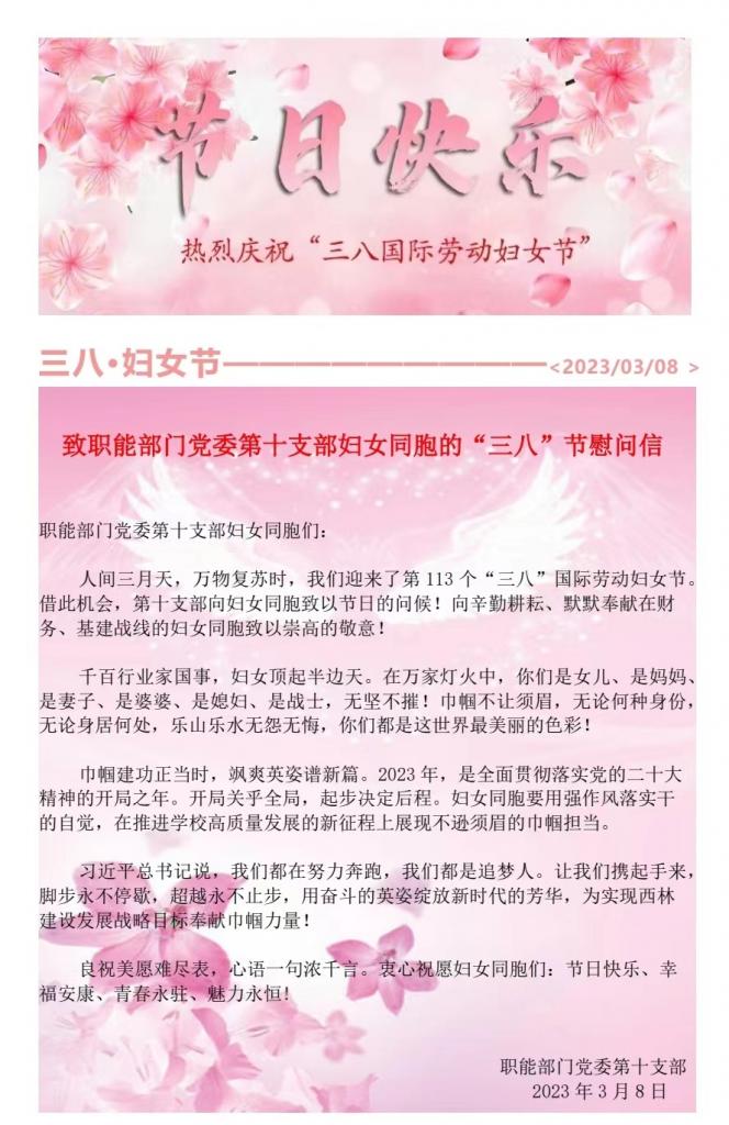 为铸造党员、职工幸福,真正把关爱落到实处, 3月8日,职能部门党委第十支部以慰问信送祝福的方式,向支部妇女同胞致以节日的问候!