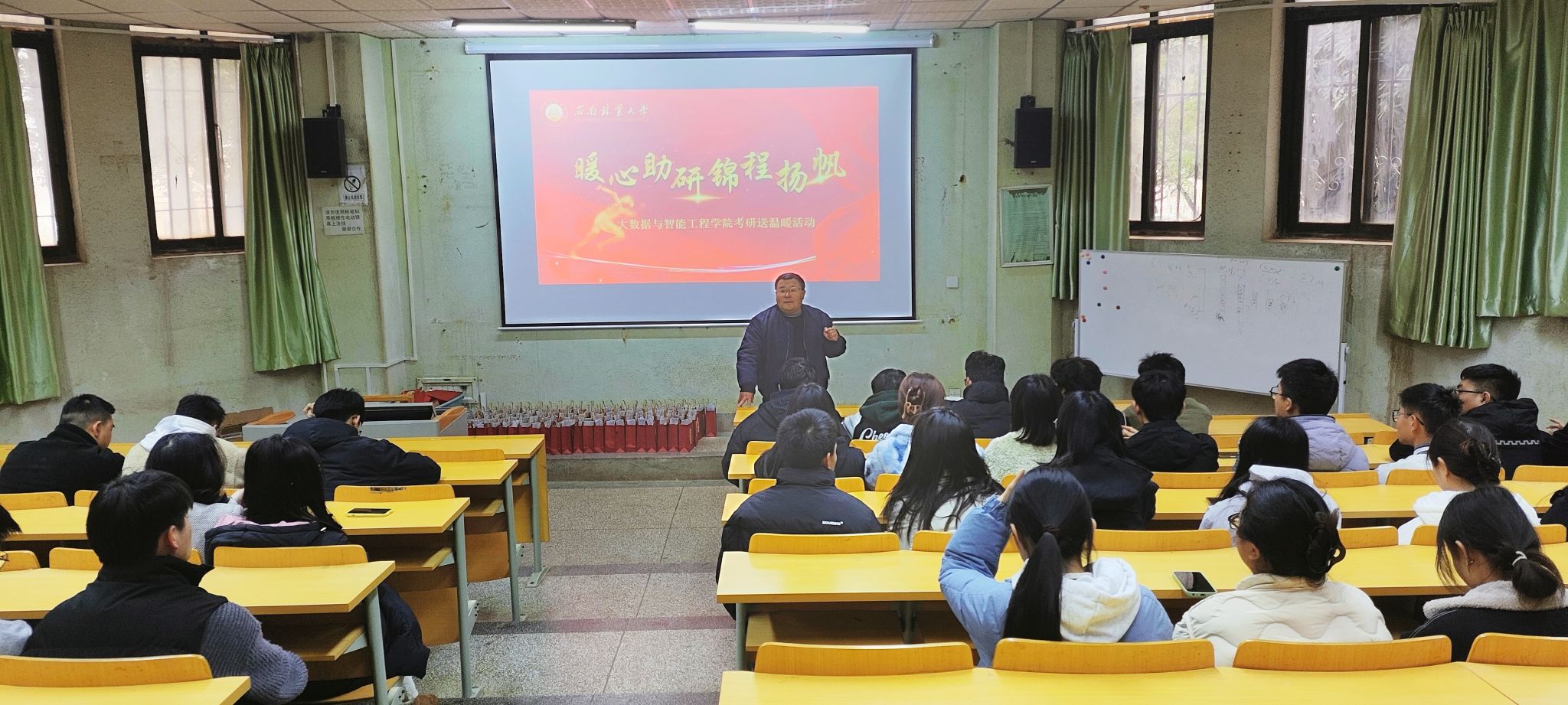 李会朋强调诚信应考的的重要性,叮嘱同学们考前要注意心态调整、身心调节,要充分利用有限时间进行查漏补缺,鼓励大家以积极饱满的精神状态迎接考试。李会朋代表学院为2025届考研学子送上学院精心准备的“考研助力大礼包”。(来源:大数据与智能工程学院/文/图:李健豪/审核:李会朋/初审:张冉/复审:冷瑾/终审:张武先, 柏顺文/责任编辑:张冉)
