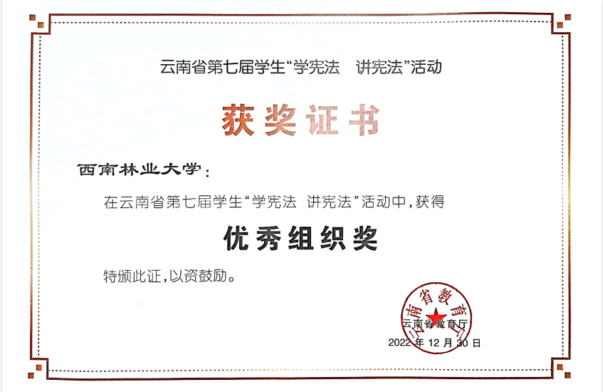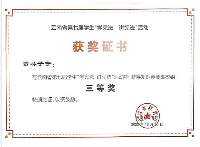 云南省教育厅主办的云南省第七届学生“学宪法 讲宪法”活动总决赛中,kaiyun体育荣获优秀组织奖,文法学院2020级法学专业本科学生贾林子宁同学获云南赛区知识竞赛高校组三等奖,2020级法学专业本科学生雷鸣浩同学获云南赛区演讲比赛高校组优秀奖,潘昭宇老师获云南赛区高校组指导教师三等奖,丁发林老师获云南赛区高校组指导教师优秀奖。