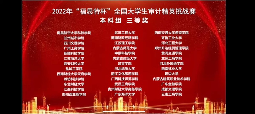 11月26日,2022年“福思特杯”全国大学生审计精英挑战赛在线上举办,来自全国365所高校的396个团队参加本次大赛,kaiyun体育会计学院代表队喜获全国本科组三等奖。
