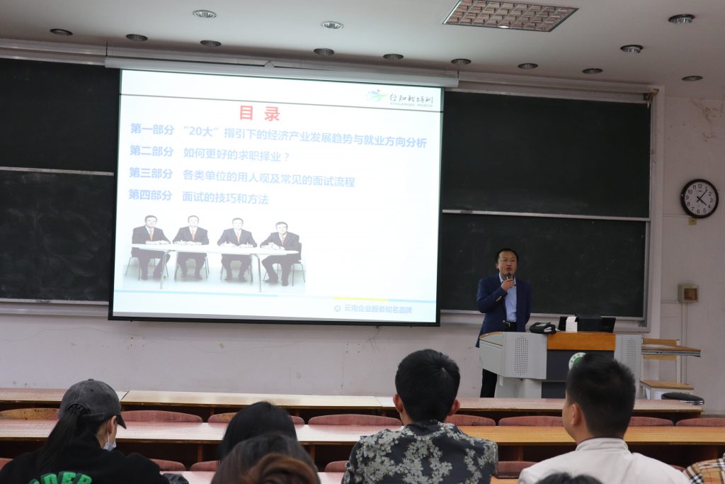 刘克伟围绕经济发展趋势与就业方向分析、如何更好地求职择业、各类单位的用人观及招聘流程、面试的技巧和方法四个方面进行讲解,指导毕业生明确职业方向,提前作好计划,用统计数据为学生分析考研、考公、就业的道路选择,建议学生“先就业、后择业”。