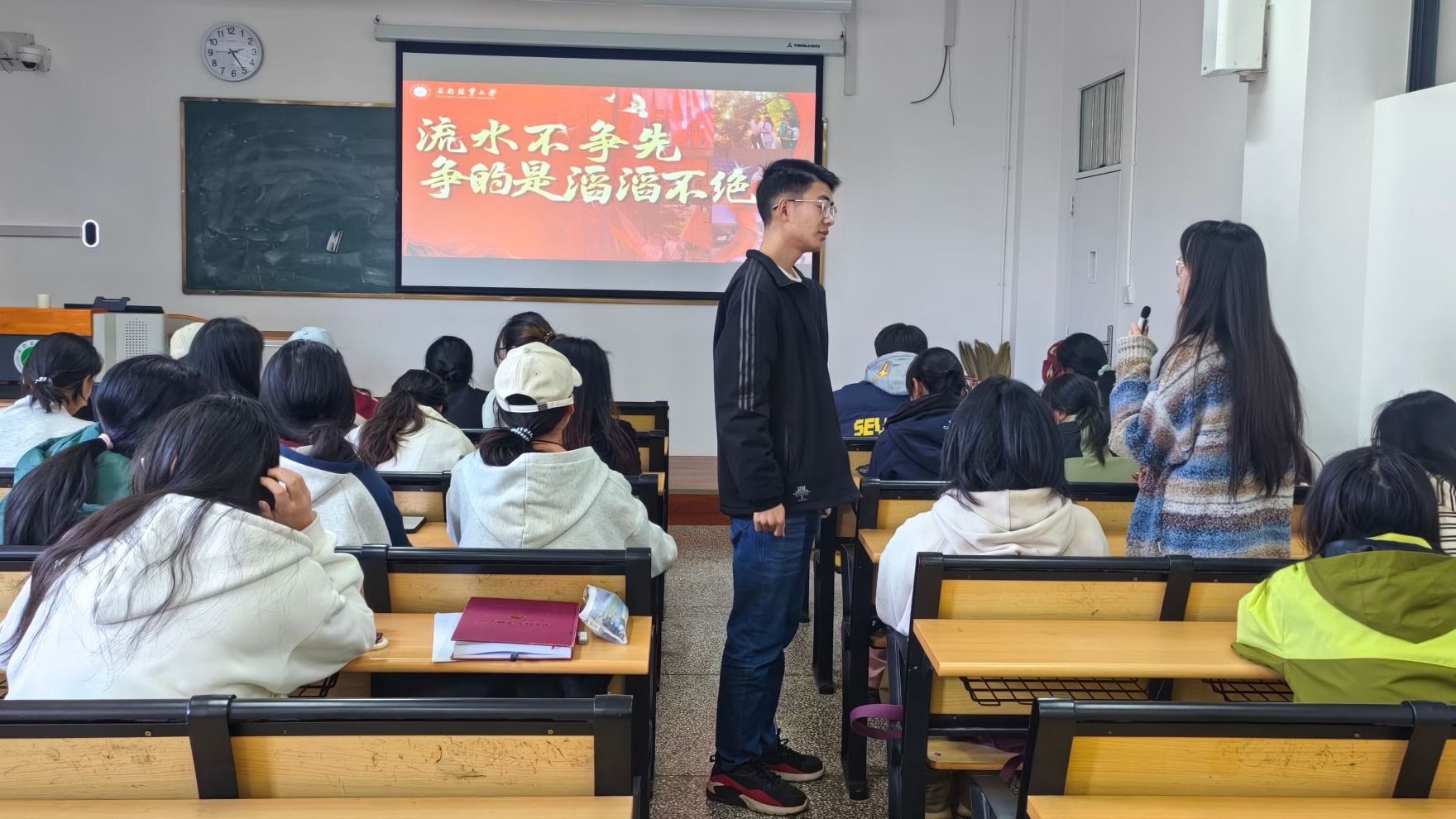 12月24日 ,“身边的榜样”宣讲团成员、校大学生年度人物王荣锋、张红玲走进“一站式”学生社区第二片区相关班级开展朋辈宣讲活动。