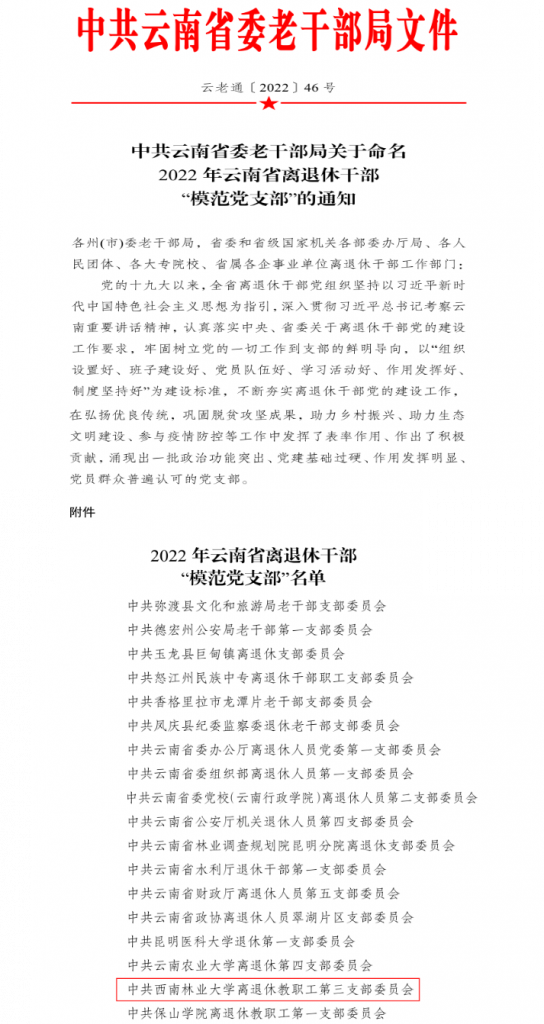 为进一步加强离退休干部党组织建设,牢固树立党的一切工作到支部的鲜明导向,根据有关文件精神,离退休工作处委员会第三支部经过自检自查、自愿申报、初步遴选、实地考核、评审复核等程序,已到达党支部规范化建设标准荣获“模范党支部”光荣称号。