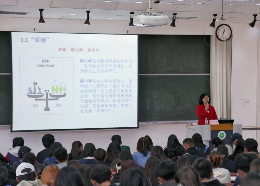 邓志华为同学们介绍了中国减碳路线“三步走”方针以及“碳达峰十大行动”,引导同学们树立绿色低碳、节能先行的生活理念,讲解了生态文明的概念以及习近平生态文明思想的主要内容。她阐述了当前生态环境面临的严峻形势,并进一步探讨大学生提升生态文明素养的方法。