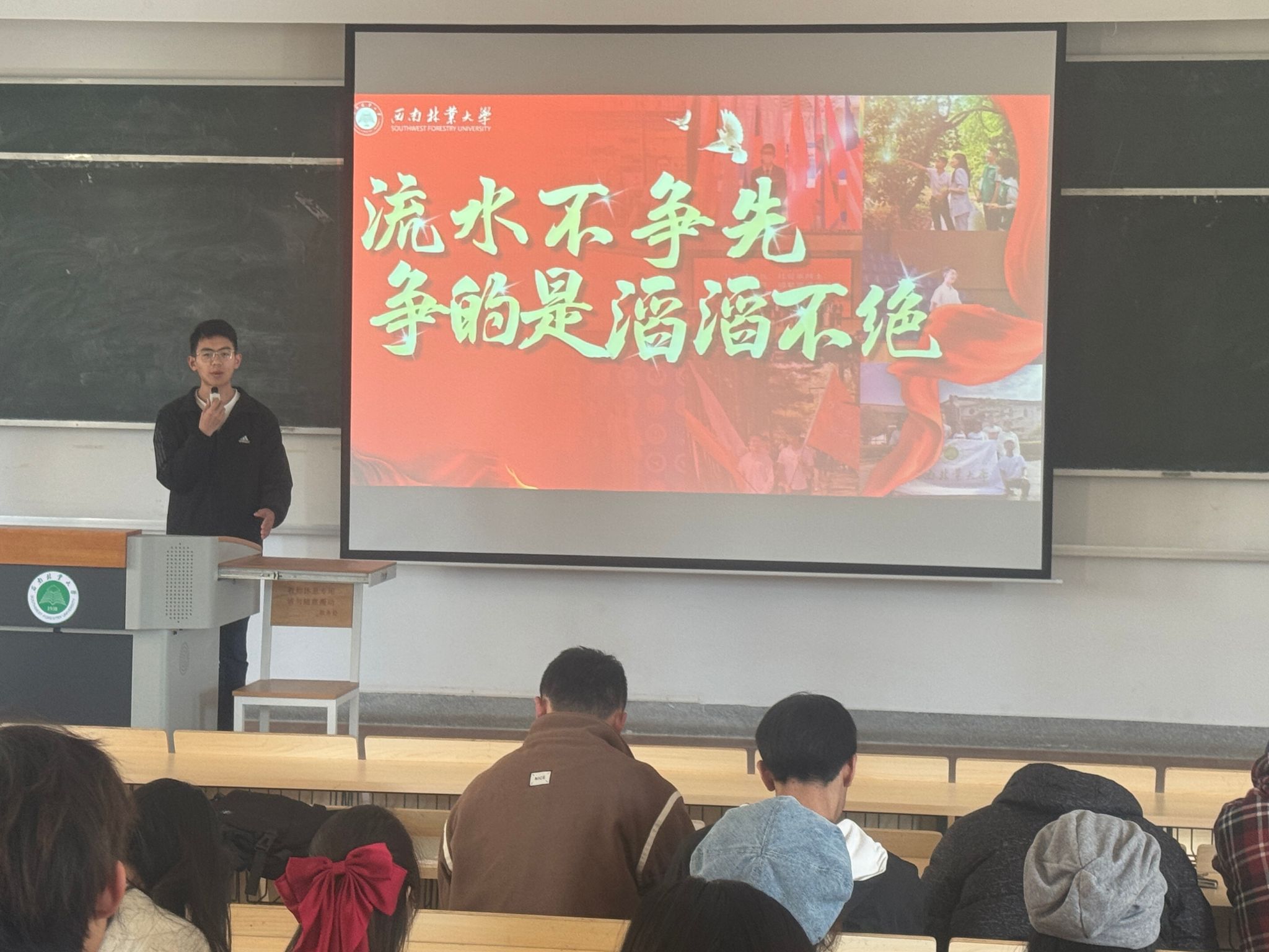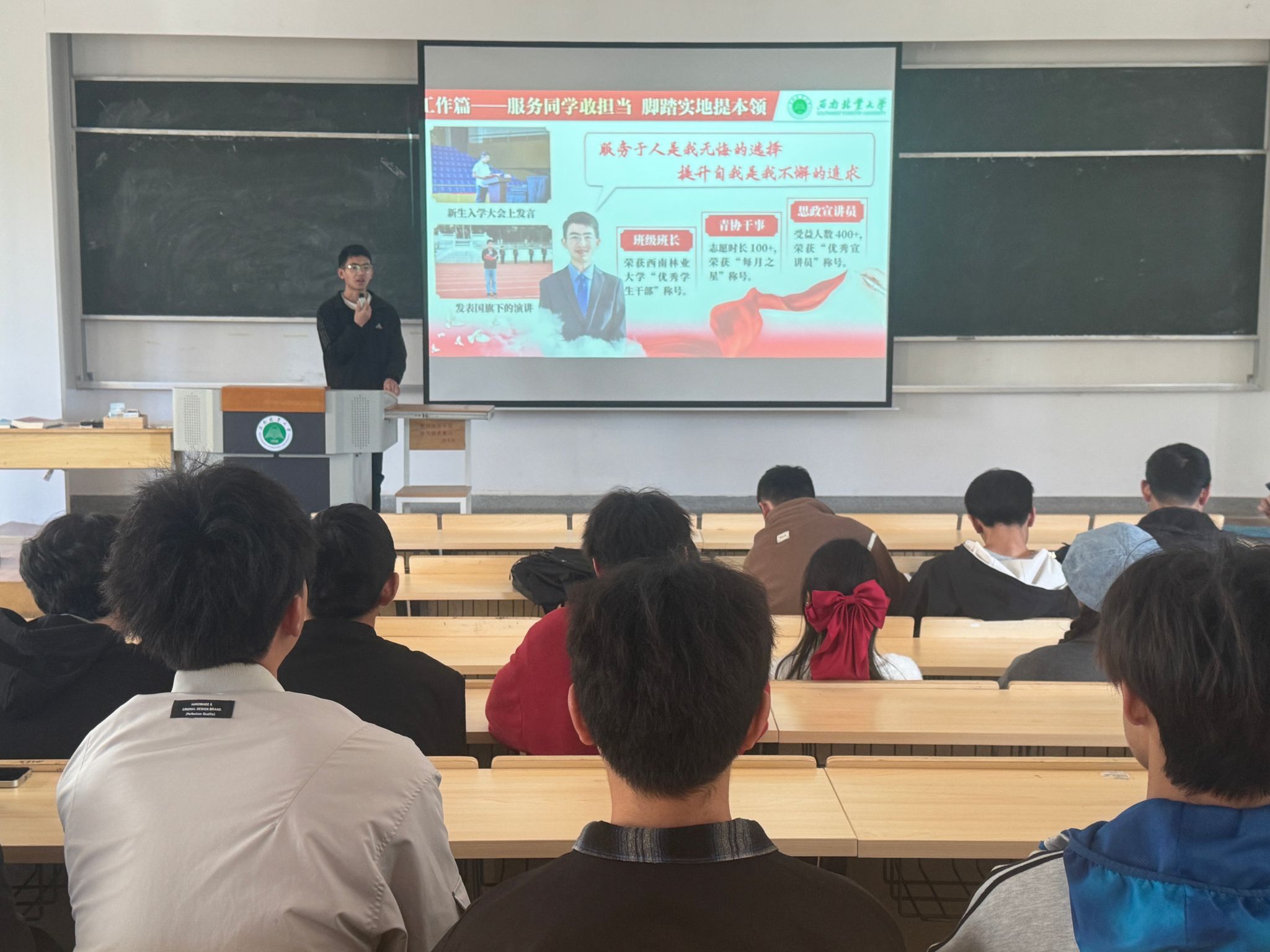 王荣锋同学围绕“行而不辍,未来可期”这一主题,结合西南联大历史事实和杨善洲先进事迹,引导同学们以榜样为镜,树立崇高理想,努力成为新时代的有为青年。他还以饱满的热情分享了自己在竞赛、科研、工作、实践和研学等方面的拼搏故事。