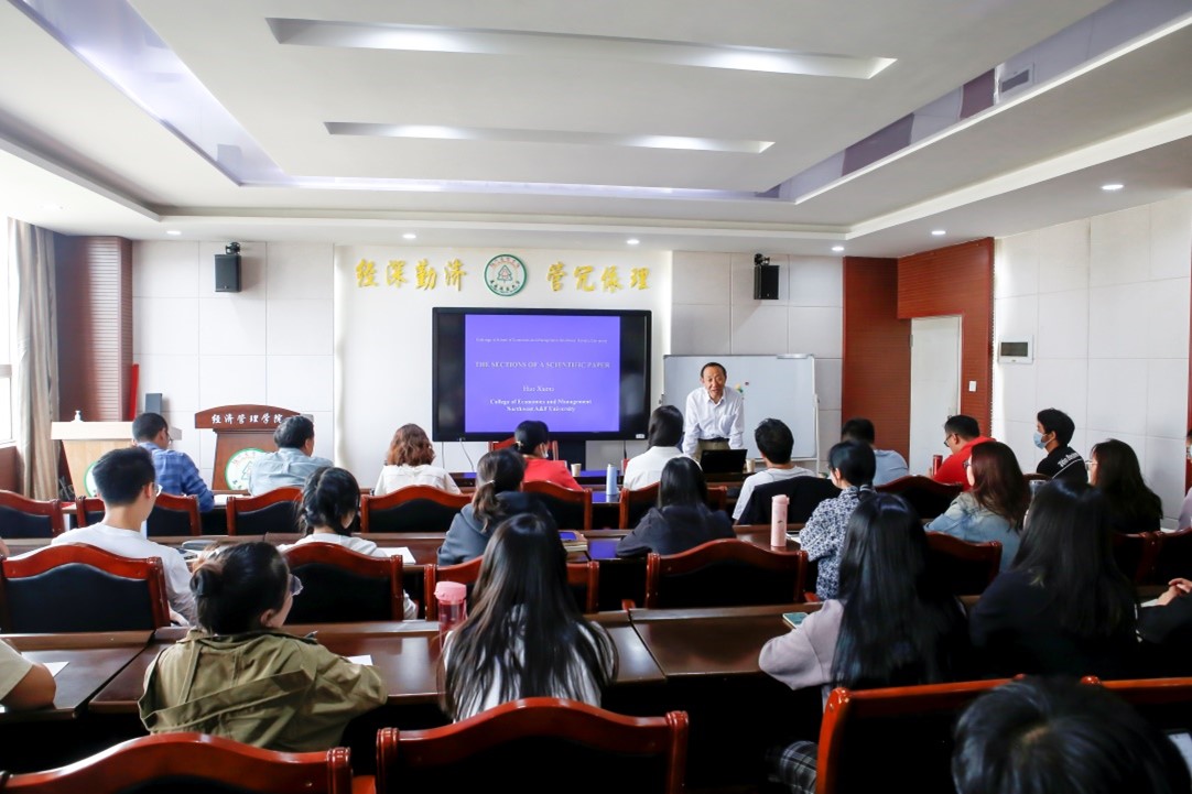 26日,霍学喜从英文论文的主题、题目、摘要、引言、方法、结论与启示等方面讲解英文论文的框架及英文论文写作注意事项。27日上午,霍学喜以“农业产业高质量发展背景、机理与路径”为主题为师生作报告。两场讲座内容深入浅出、精彩纷呈,引发了师生们的思考和讨论,获得了在场师生的一致好评。