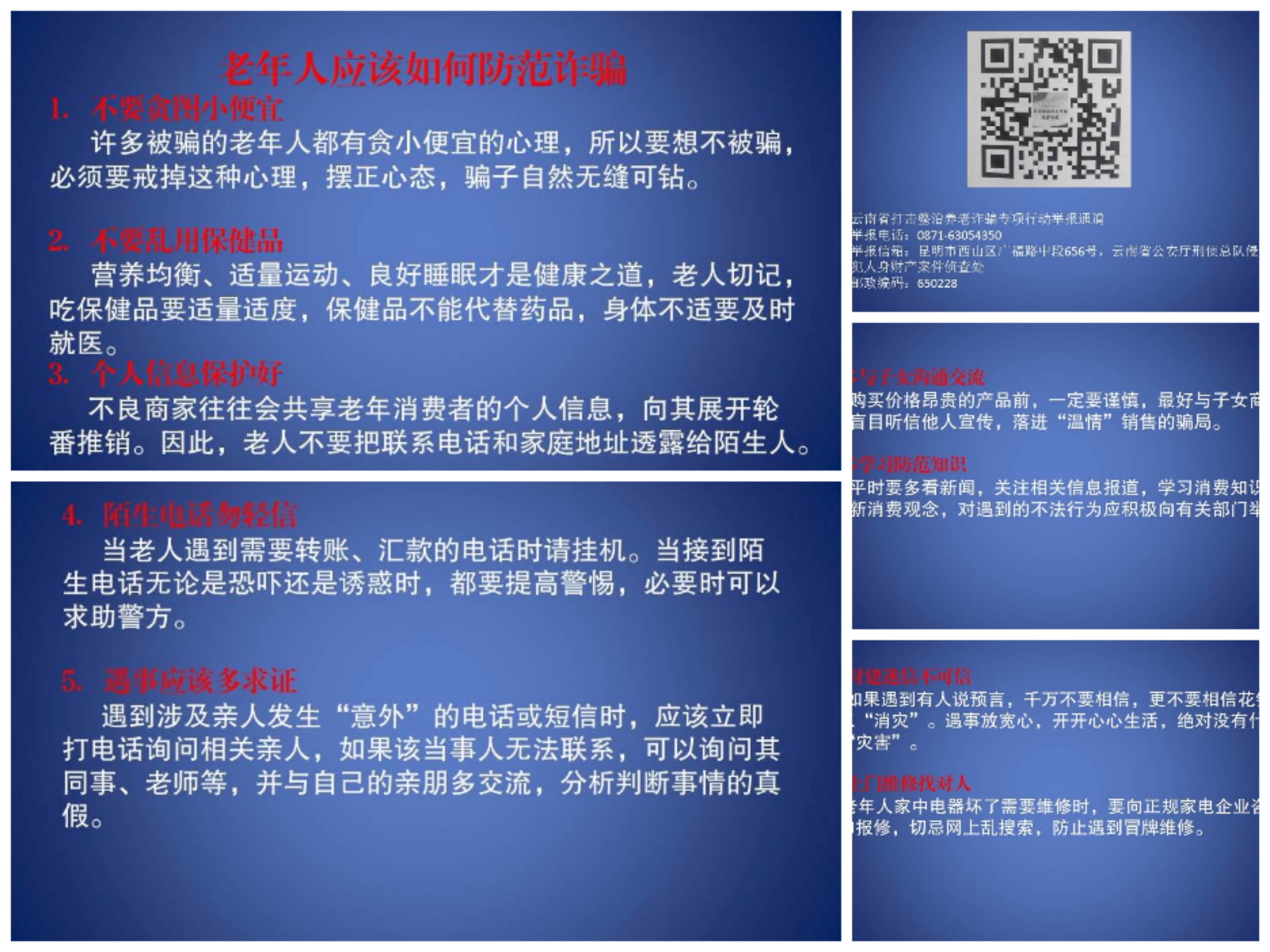 剖析“套路”,提高防诈能力。利用钉钉开展以案说法、以案促防,分析以提供“养老服务”、投资“养老项目”、销售“养老产品”、宣称“以房养老”、代办“养老保险”等为名实施诈骗的典型案例,向老人们披露养老诈骗“套路”手段,普及防范技巧,宣传如何应对养老诈骗、电信诈骗等防诈反诈知识,劝导老年人在日常生活中要提高警惕,一定要将“不听、不信、不转账”牢记于心,遇到问题第一时间报警。