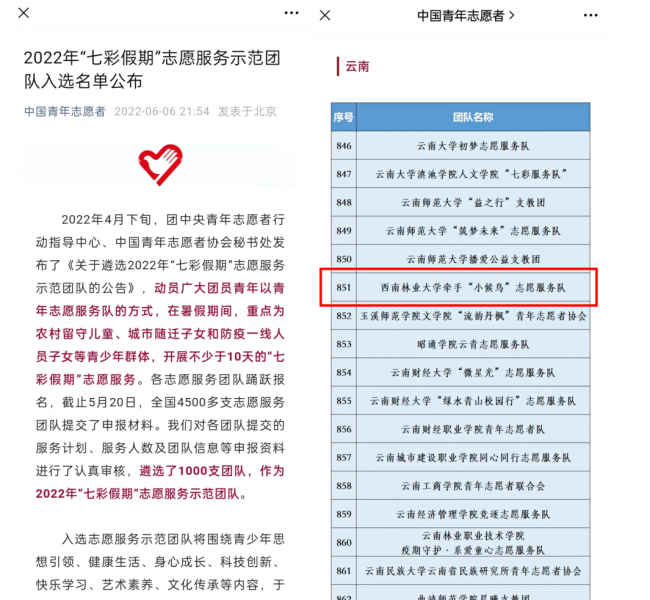 6月6日,团中央青年志愿者行动指导中心、中国青年志愿者协会秘书处公布了2022年“七彩假期”志愿服务示范团队名单,kaiyun体育艺术与设计学院“牵手小候鸟”志愿服务队在全国参与申报的4500多支志愿服务团队中脱颖而出,成功入选。