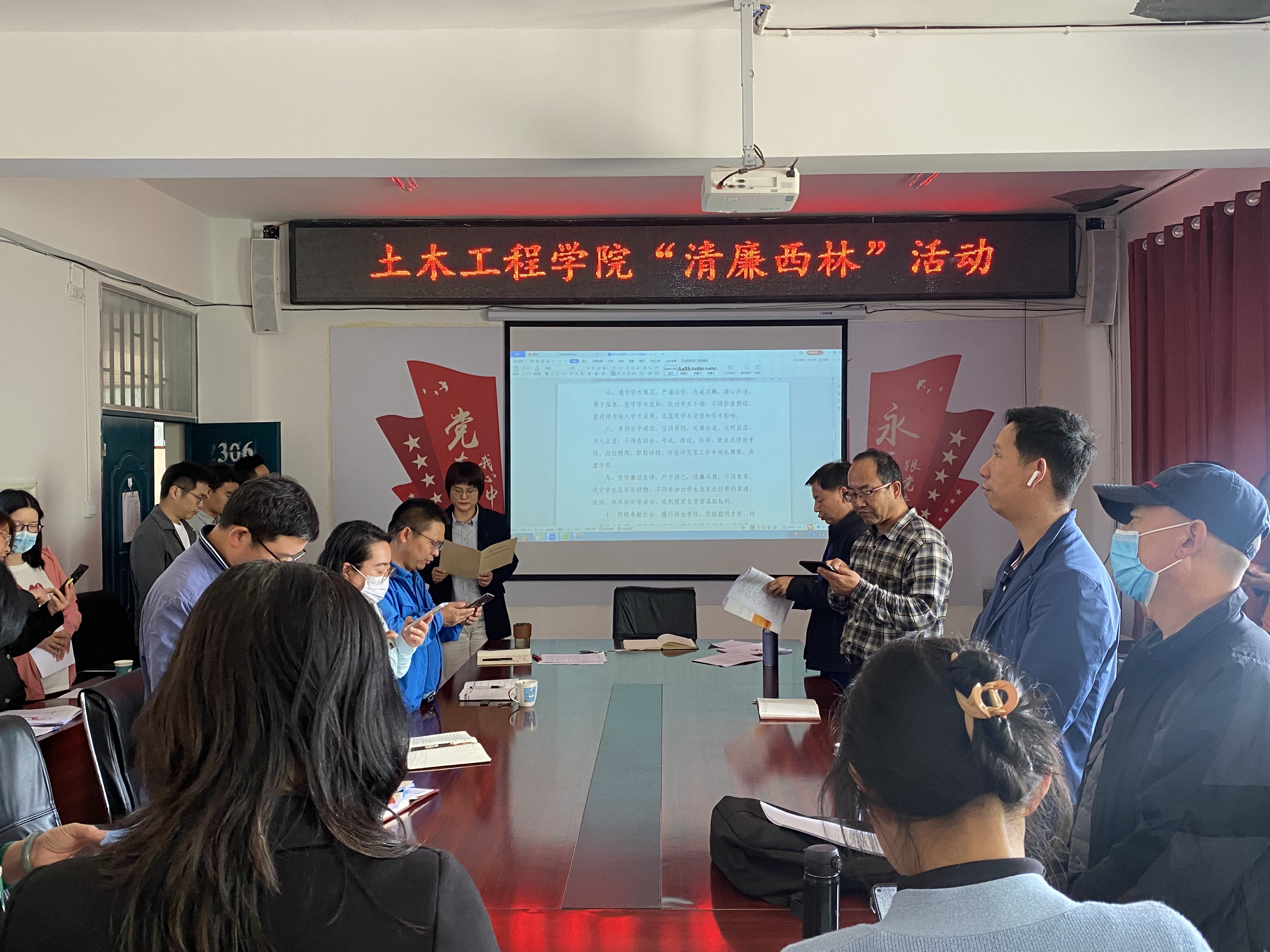 谭泽飞根据校纪委印发的“清廉kaiyun体育”学习材料,通报了近期教育系统违纪违法案例,教育广大教职工要遵纪守法、清正廉洁;全体与会人员通过集体观看学校活动剪辑《清廉kaiyun体育(2021)丨让清风正气吹遍校园》,学习廉洁文化精神;通过集中观看李乡旺、辉朝茂、蓝增全、董文渊等先进典型事迹,号召大家向榜样学习;学院副院长(主持工作)孙微微领学《新时代高校教师职业行为十项准则》,全体教职工诵读进行师德师风教育,呼吁学院教职工立德树人,争做“四有”老师。