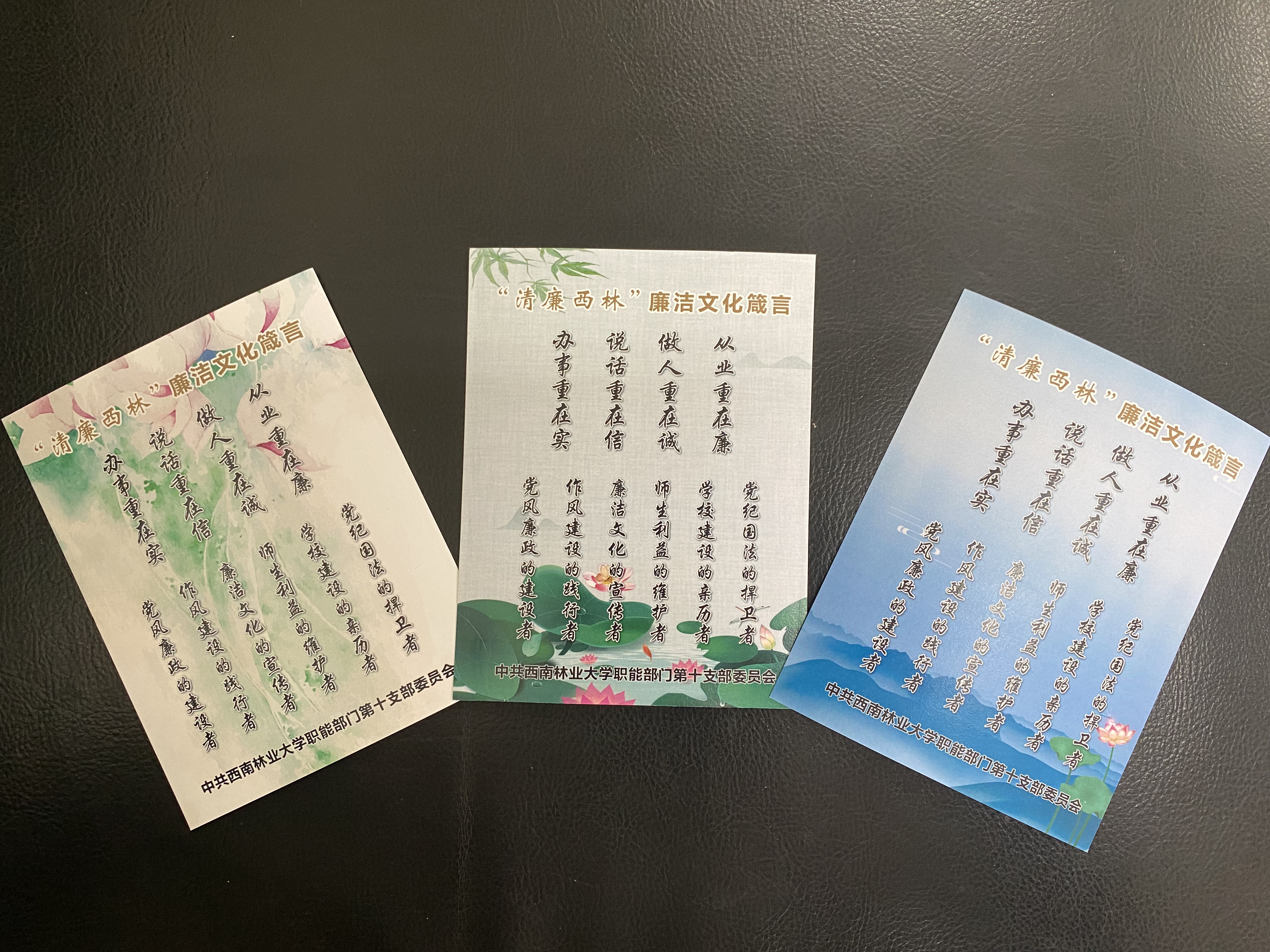 为落实落细“清廉kaiyun体育”建设活动要求,不断丰富文化周活动内容,职能部门党委第十支部向全体党员干部群众制作廉洁文化箴言卡,以“四重”“六者” 提倡廉洁自律,秉公办事,不徇私情,不谋私利,为民服务,清白做人的精神。这是支部推进“清廉kaiyun体育”建设文化周活动和廉洁风险防控工作,确保党员干部随时学习、处处对照、警钟长鸣推出的又一“新招”。