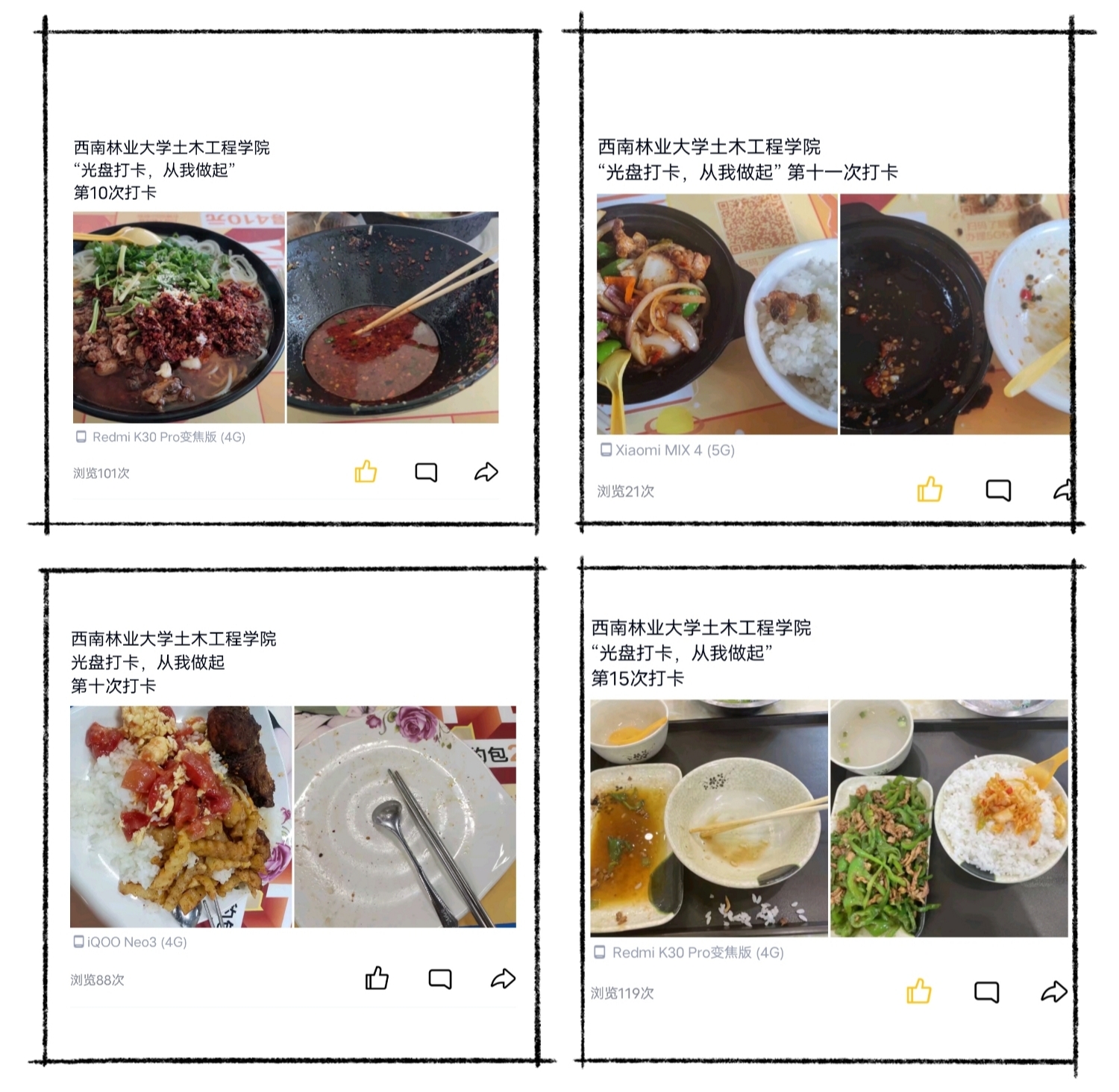 土木工程学院组织全院学生积极参与本次活动,同学们将饭前和饭后的对比图通过发布微信朋友圈、qq空间等方式进行光盘打卡,让同学们也带动身边的亲人、朋友一起加入光盘行动。