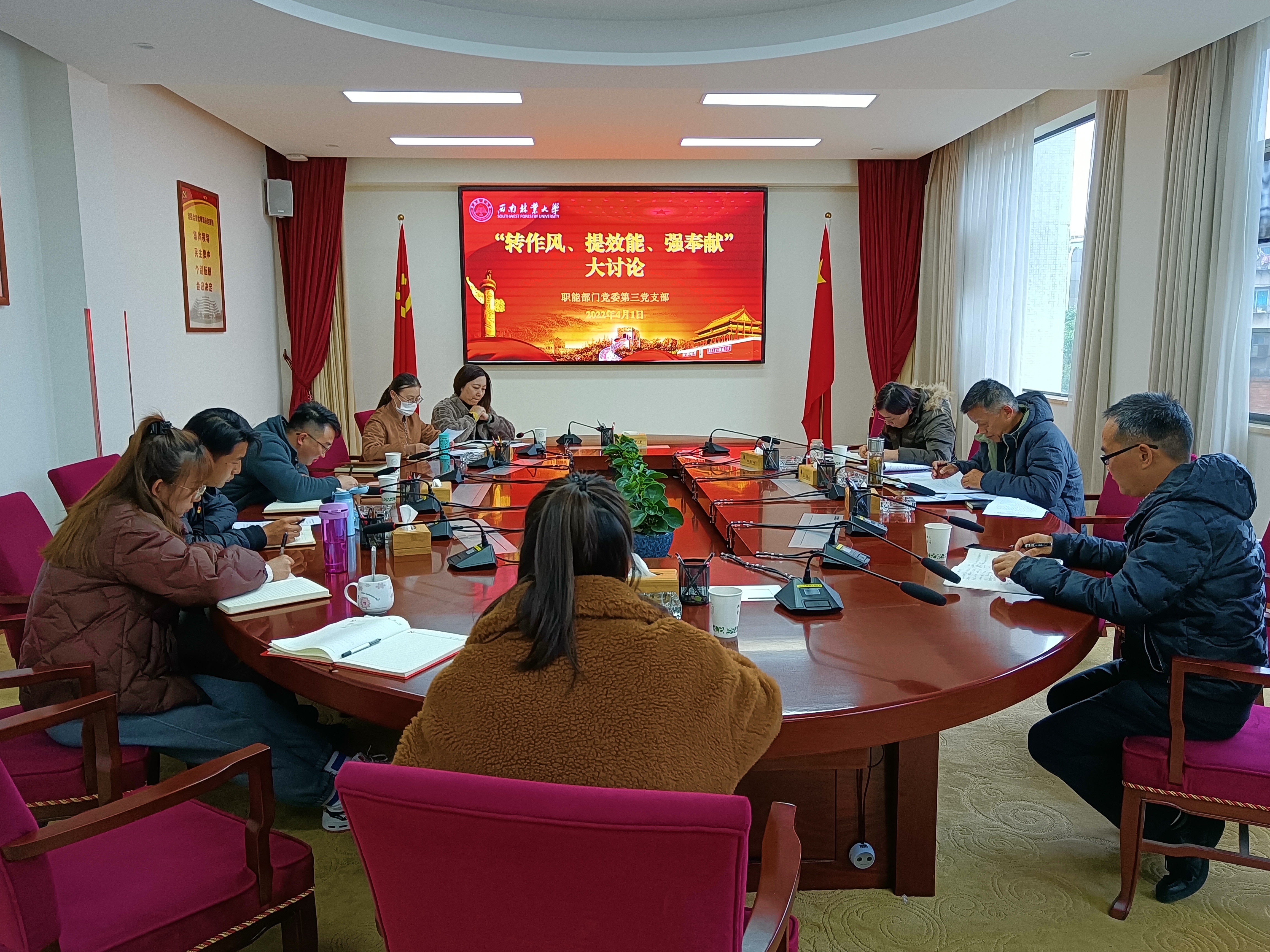 为营造“推进作风改革 加强效能建设 弘扬奉献精神”主题实践活动的良好氛围,切实抓好学习教育,进一步推动实践活动走深走实,入脑入心。4月1日,职能部门党委第三支部围绕“转作风、提效能、强奉献”开展大讨论,充分交流分享、凝聚思想共识、汇聚精神动力。