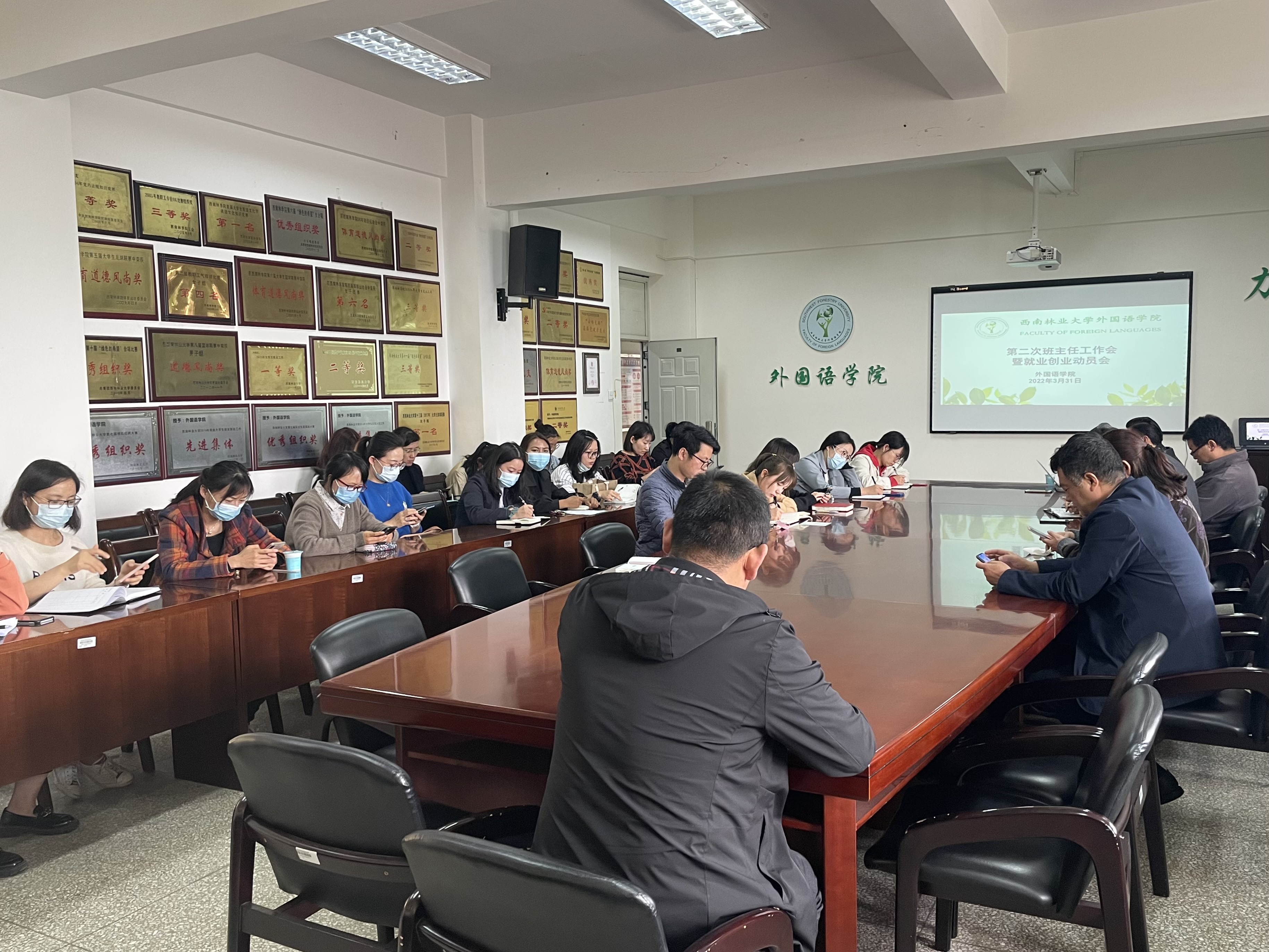 3月31日,外国语学院召开学生管理工作会议暨就业创业动员会。会议由院党委副书记李法营主持,院教学办主任钟新松、学工办主任李凌、团委书记王璐、公寓管理负责人王光铭及全体班主任和辅导员参会。