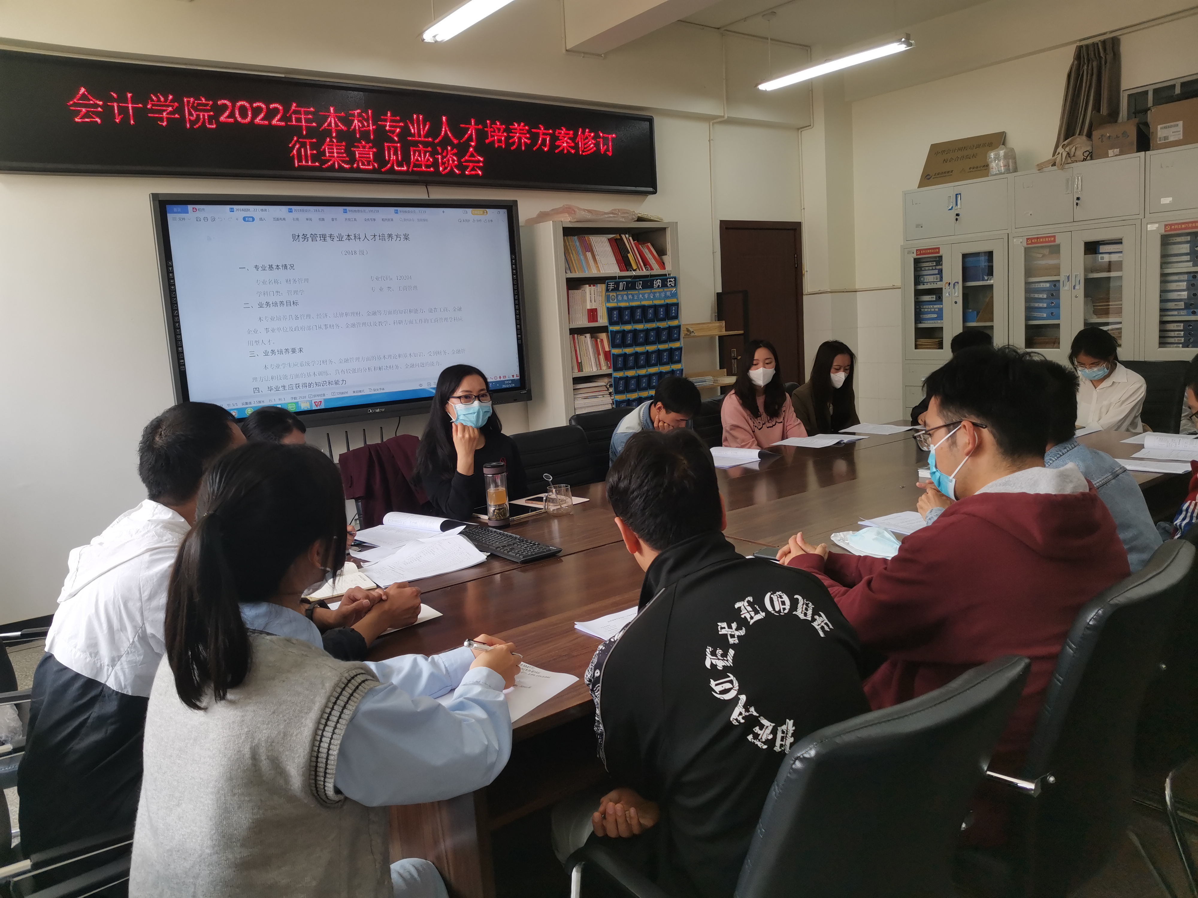会计学院于3月28日召开了线下学生座谈会,学院副院长李谦、教学秘书张金丽、杨文君,以及2022届11个毕业班的28名学生代表参加了此次座谈会。座谈会围绕培养目标、培养要求、课程体系、实践教学、毕业要求以及教学管理等方面展开讨论,提出了意见和建议。学院依托教研活动,于4月1日召开了征求意见会。