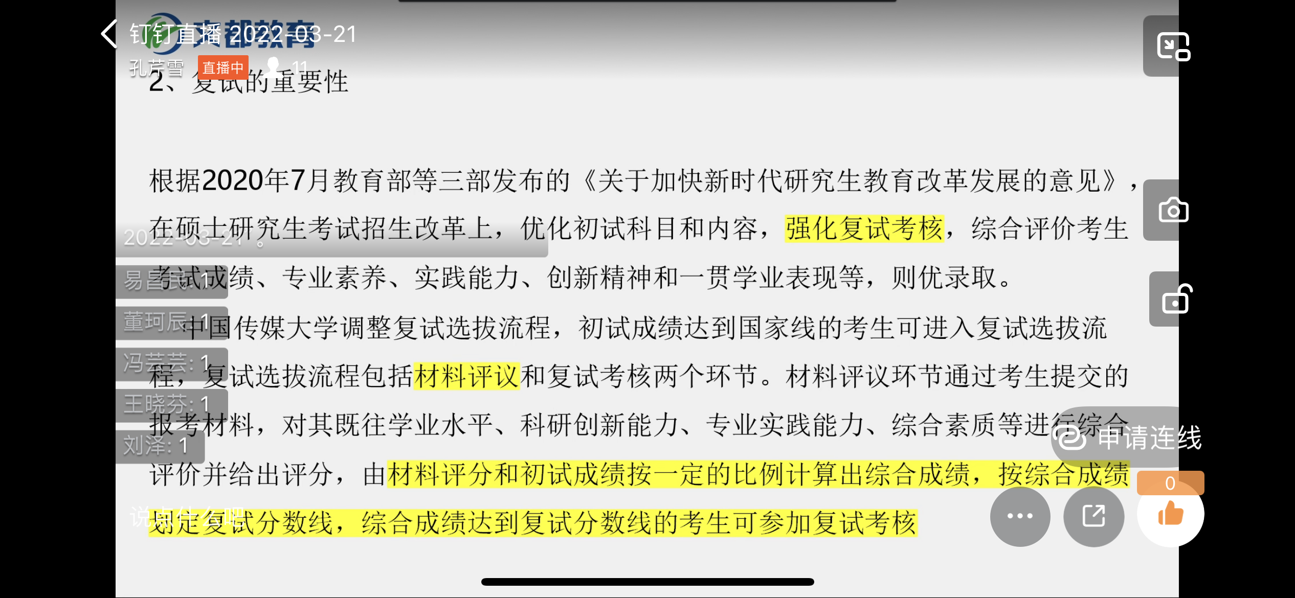 3月21日,外国语学院于联合文都考研举办专场考研复试指导线上公益讲座,共计有来自全校各文科专业20余名同学参加。